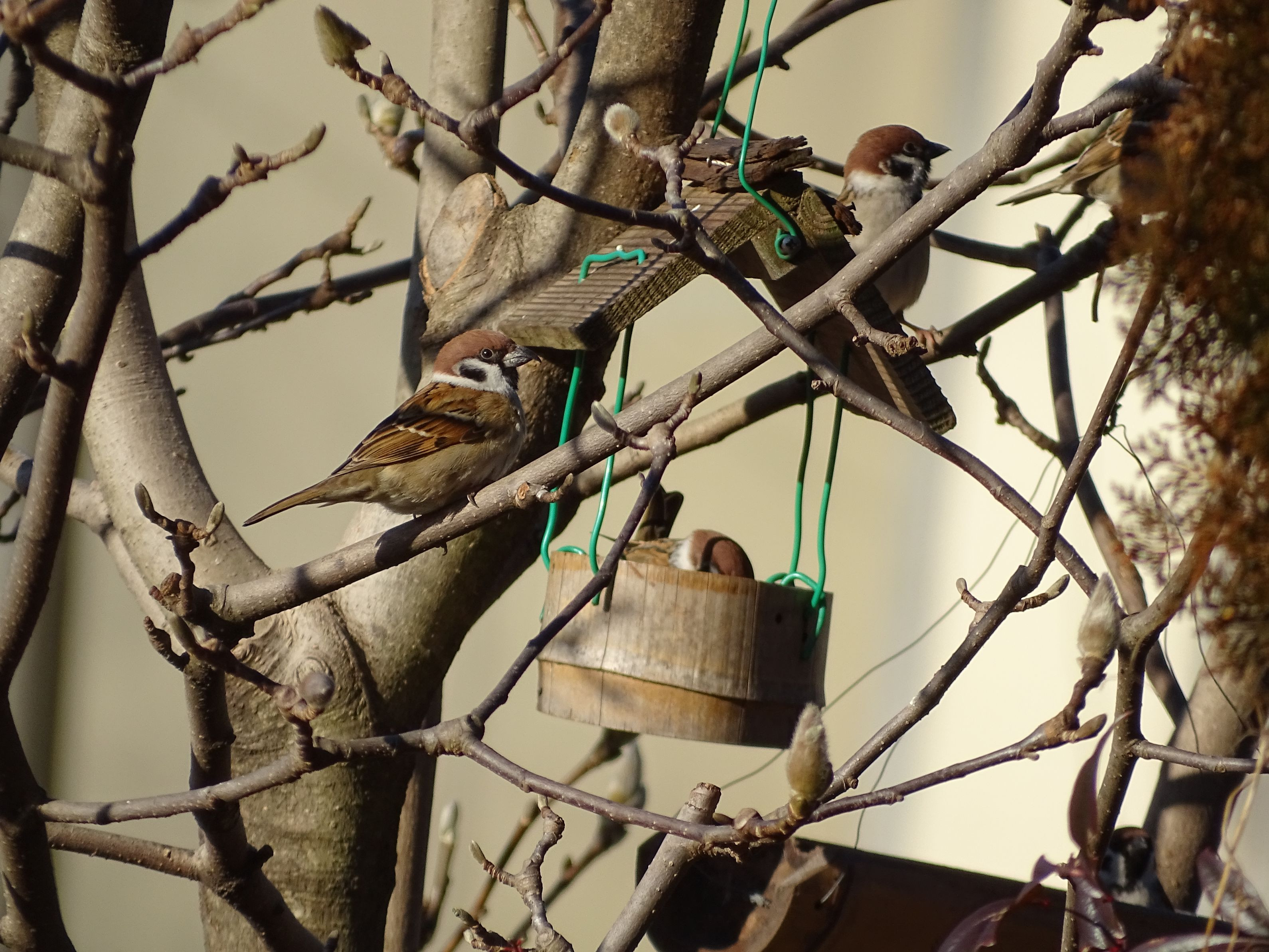 庭のモクレンのえさ入れの周りで、雀さんがお行儀良く食事の順番を待っていました