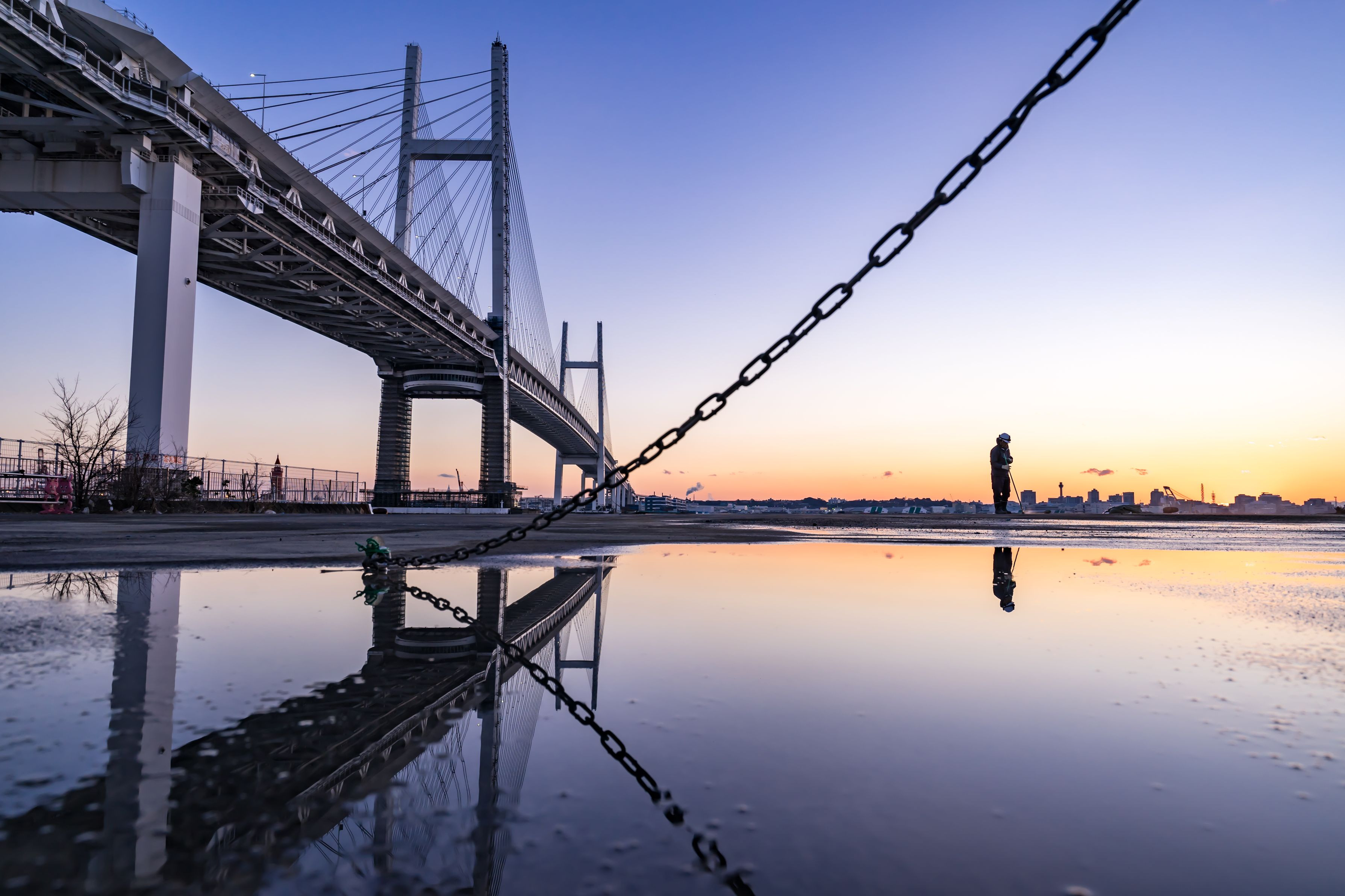 夕焼けを撮りに行ったらいい場所に水溜り発見し夕焼けそっちのけで水溜り撮影してました。作業員さんがいいアクセントになってくれました。