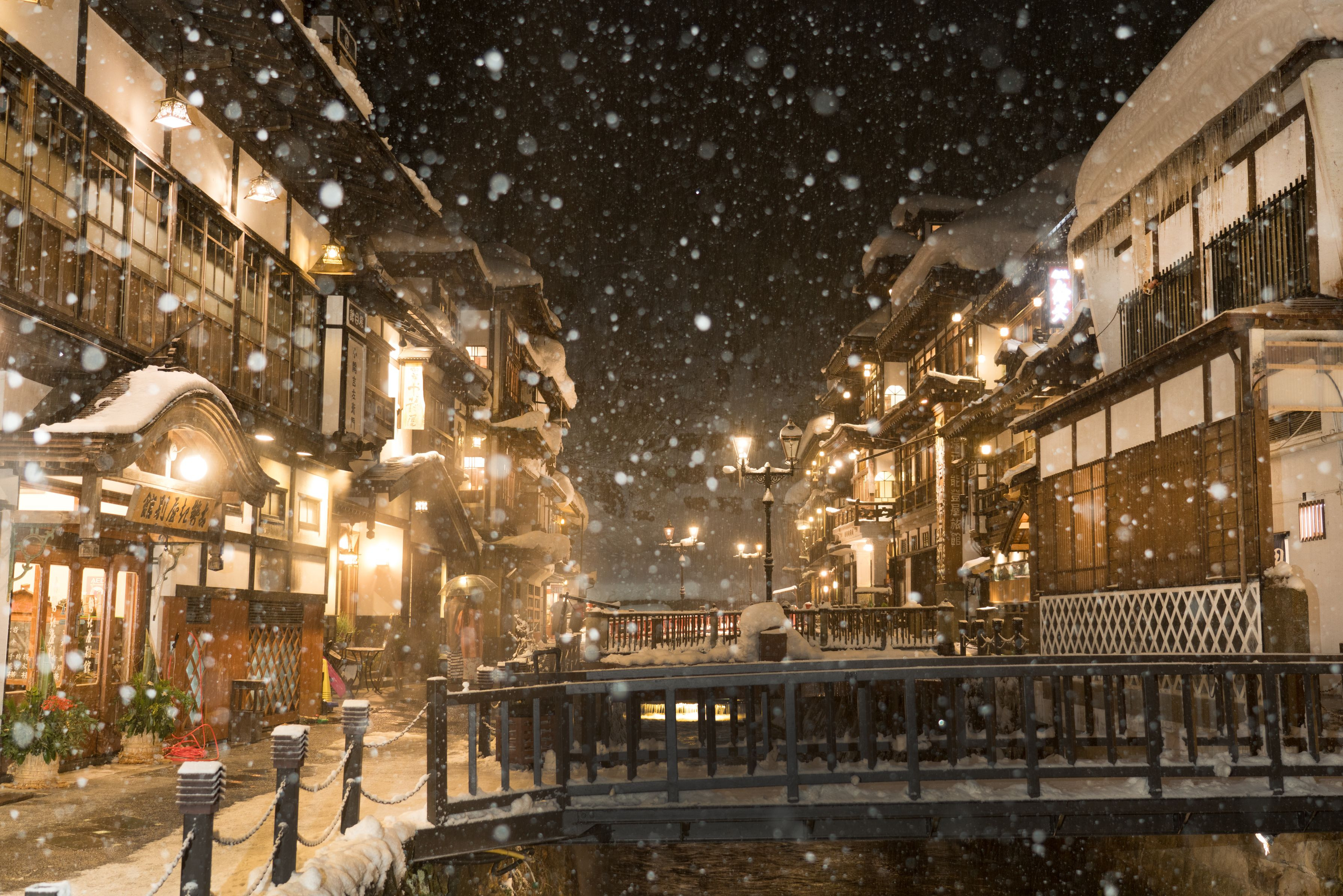 いつかはこんな魅力的な温泉街でデートしたいですよね。吹雪いている中相合傘をしている中の良いカップルがいました。