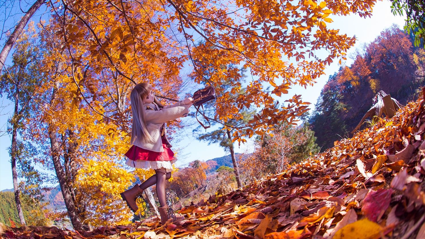 紅葉に舞う少女をイメージしました。 背景の風景に躍動感を出すのを考えて配置しました。 次はどんな風に演出するか色々かんがえますね。