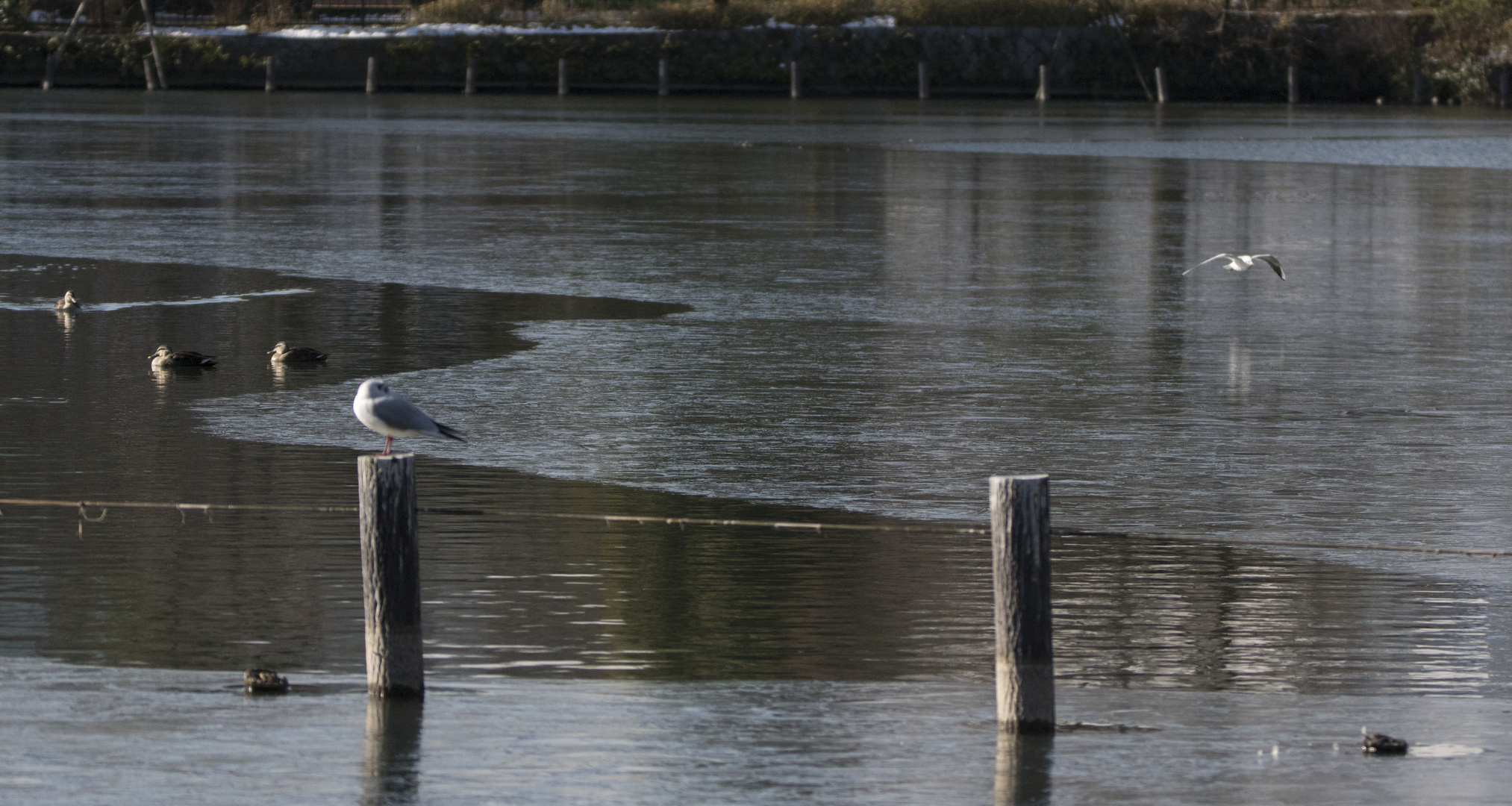 今朝は風もなく冷え込んだので、 珍しく氷が部分的に貼り面白い造形でした。