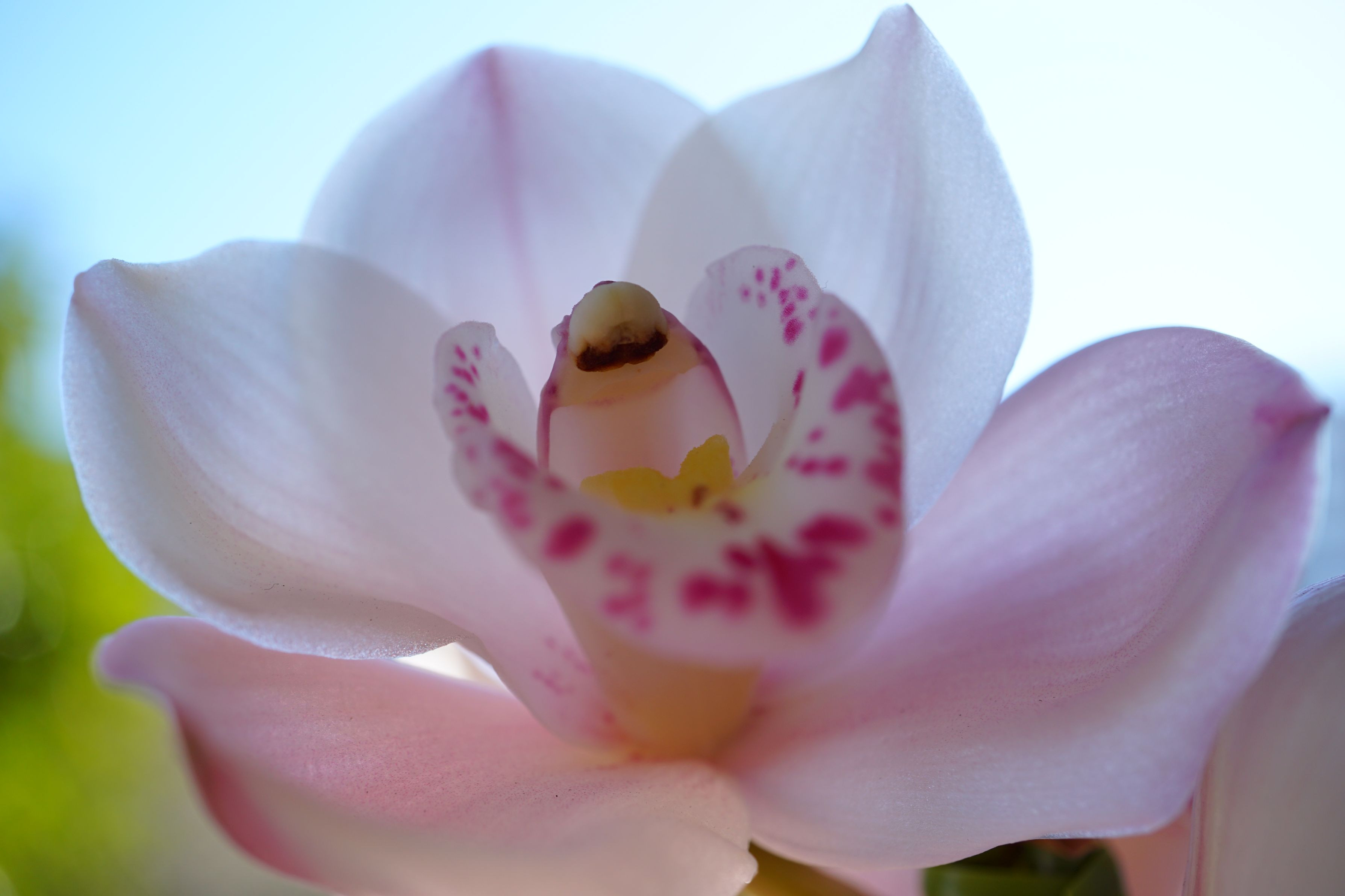 ベランダのピンクのシンピジュームを今朝逆光で撮りました。