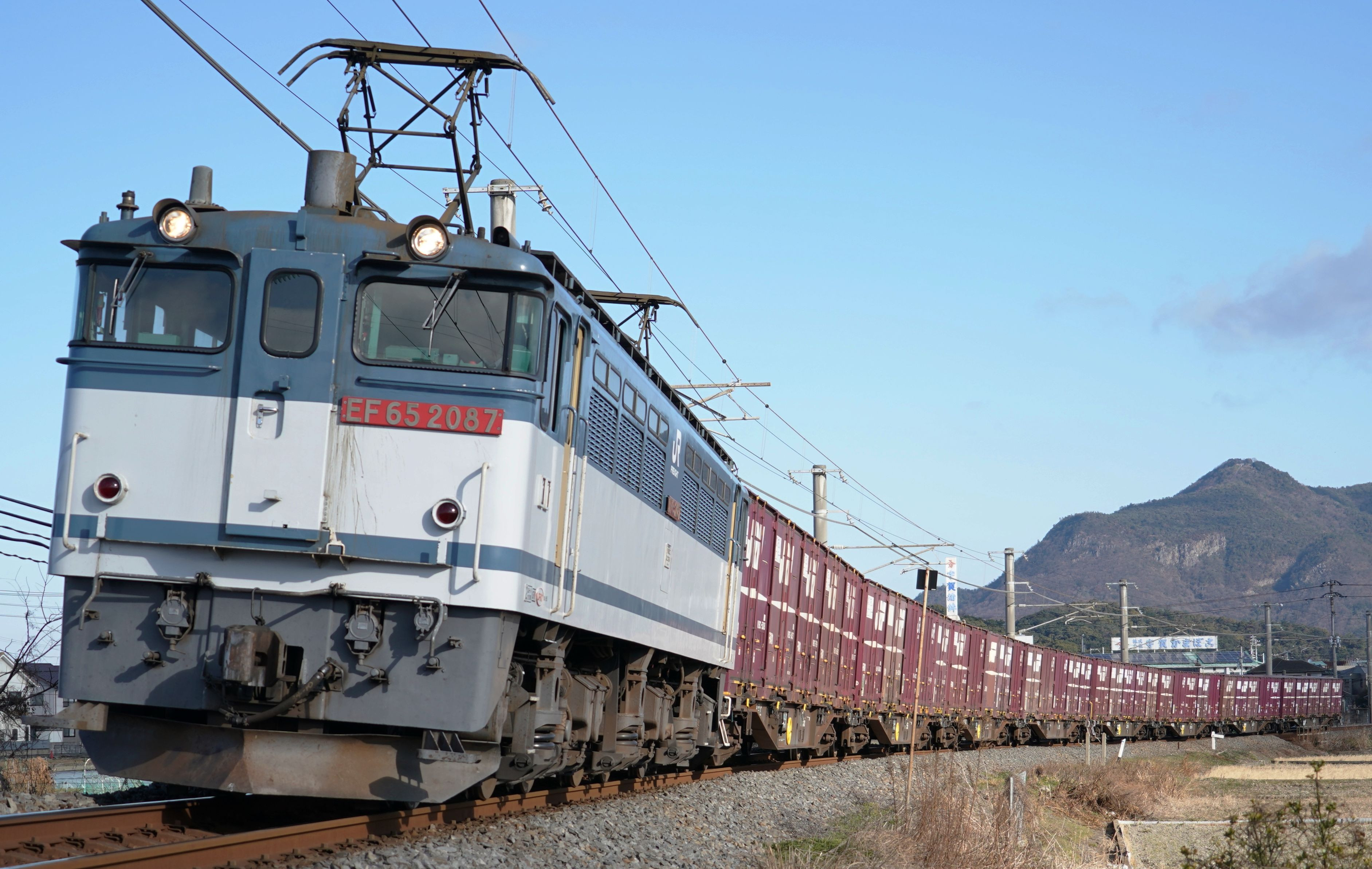 1/27の3075レ EF65 2087号機牽引 ネタ釜でもなんでもないですがコンテナ引き連れて力強くカーブに入ってくる感じがカッコよかったので撮影。