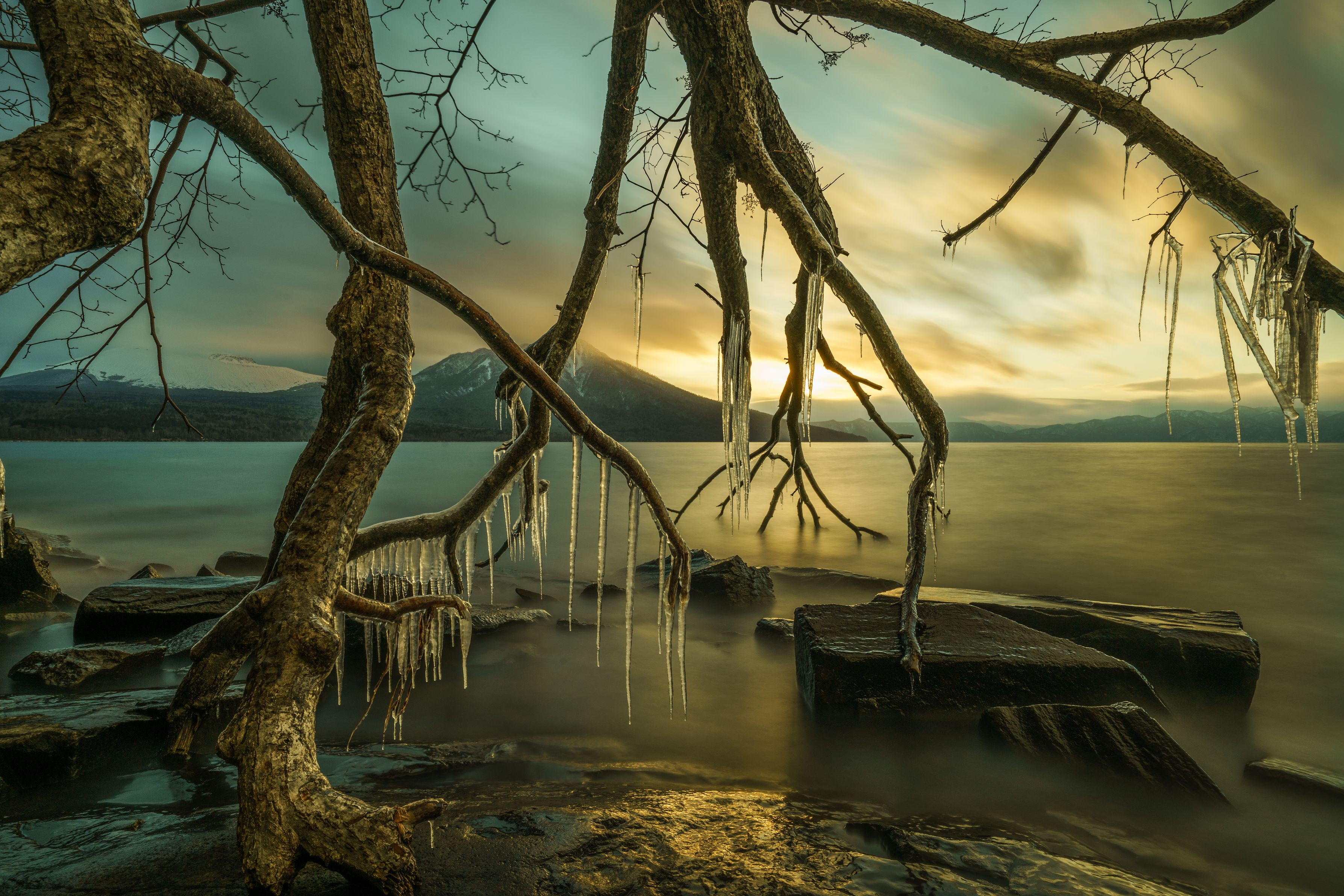 極寒の中、夕暮れの支笏湖で冬の自然が創り上げた芸術品を見つけました。
