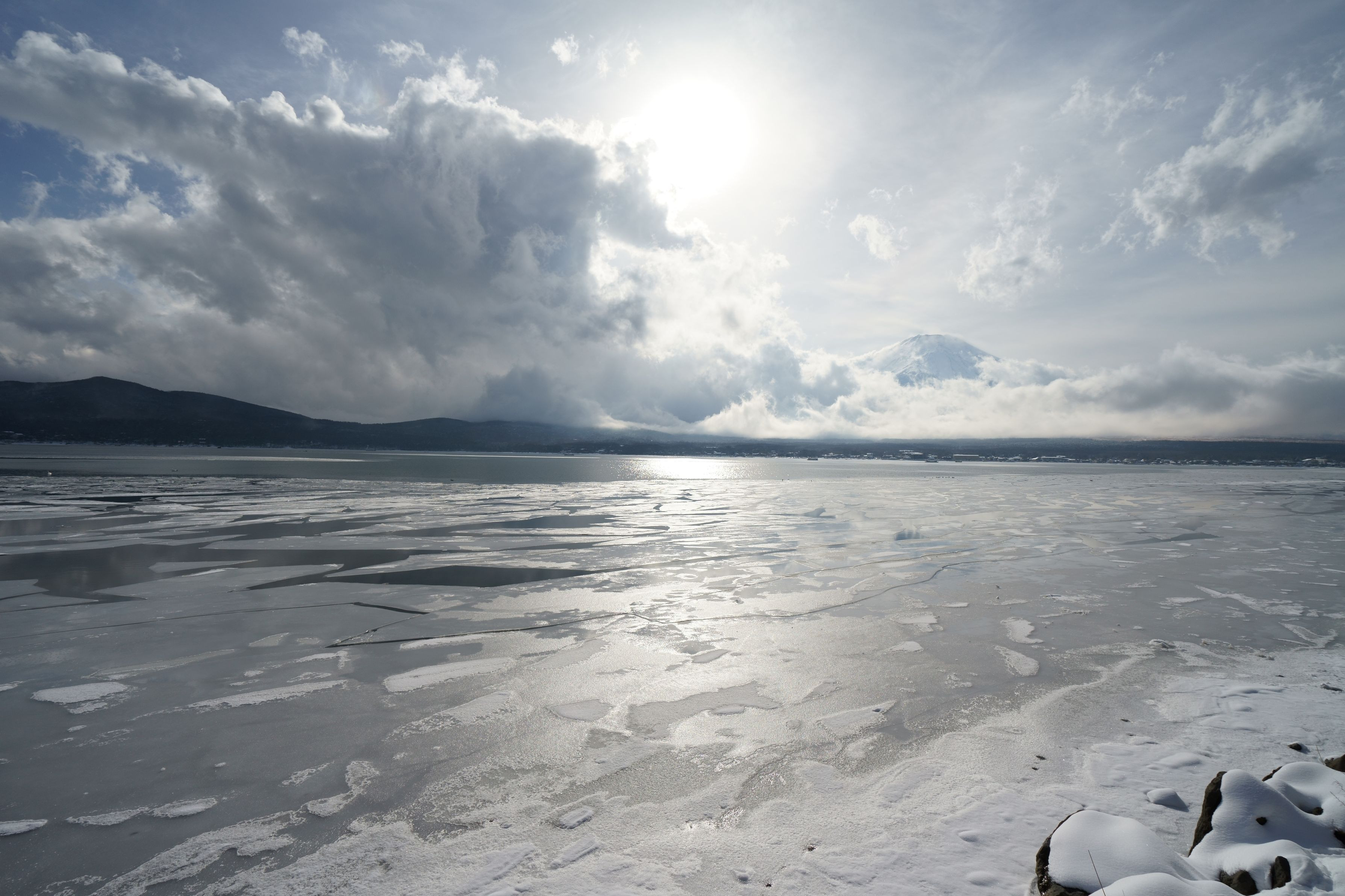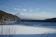 山中湖の東に位置する三国山でスノーハイクを楽しんだ日、丹沢方面から尽きせぬガスが流れ込みなかなか見ることができなかった富士山。その帰路、雲がまとわりつきながらもようやく姿を見せてくれました。湖岸にはダイヤモンド富士を待つ人々が列をなしていました。その後に訪れた精進湖では、氷結した湖面に広がる純白の雪を前景に穏やかに富士が佇んでいました。