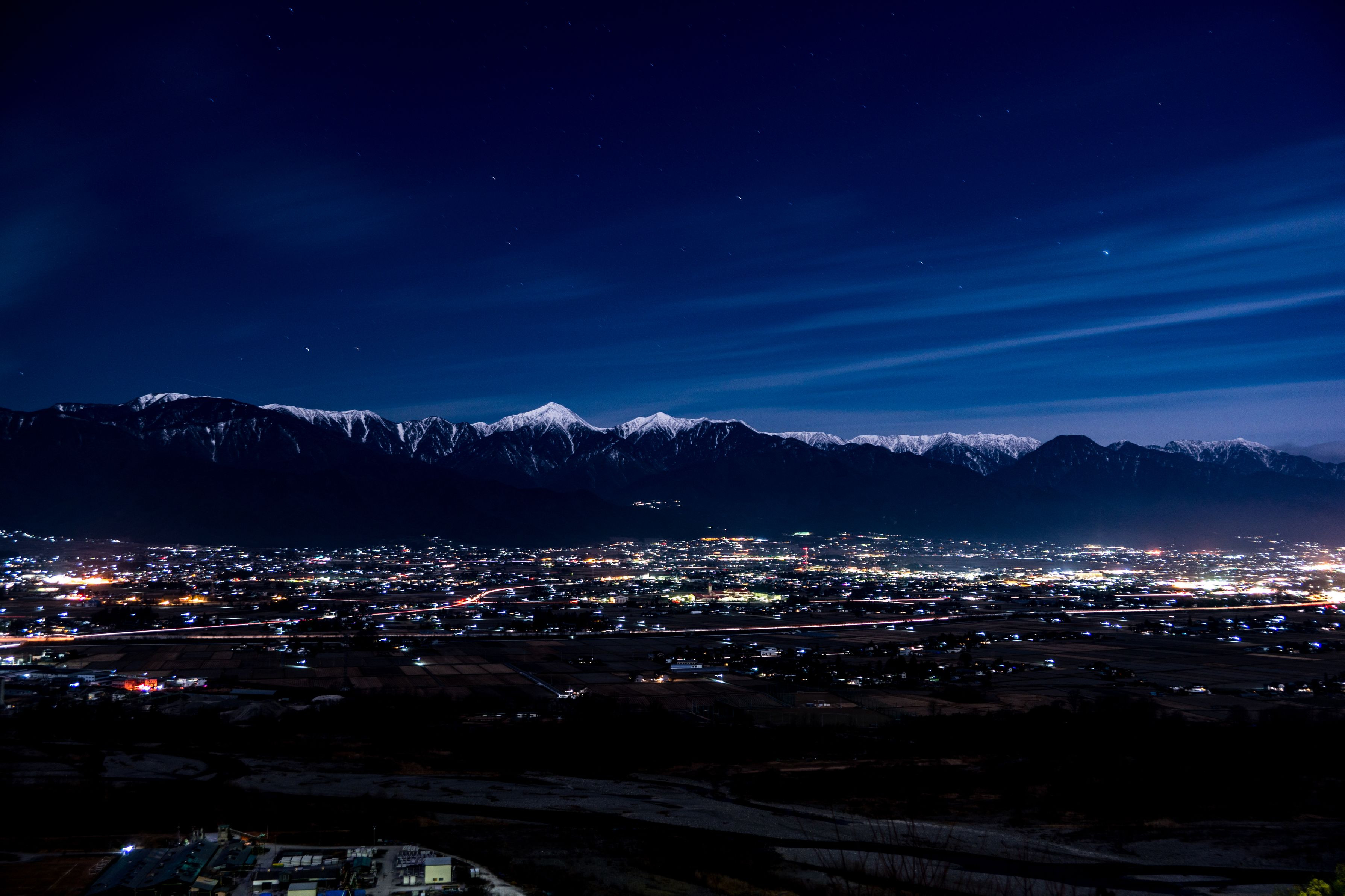 この日はスーパームーンでした。月明りに照らされたアルプスがとても印象的だったことから撮ってきました~^^; 眼下に広がるのは安曇野平です。明るすぎて満天の星空を見ることはできせんでしたが、月灯りの北アルプスも良いものですよね。(画面中央は常念と横通岳です)