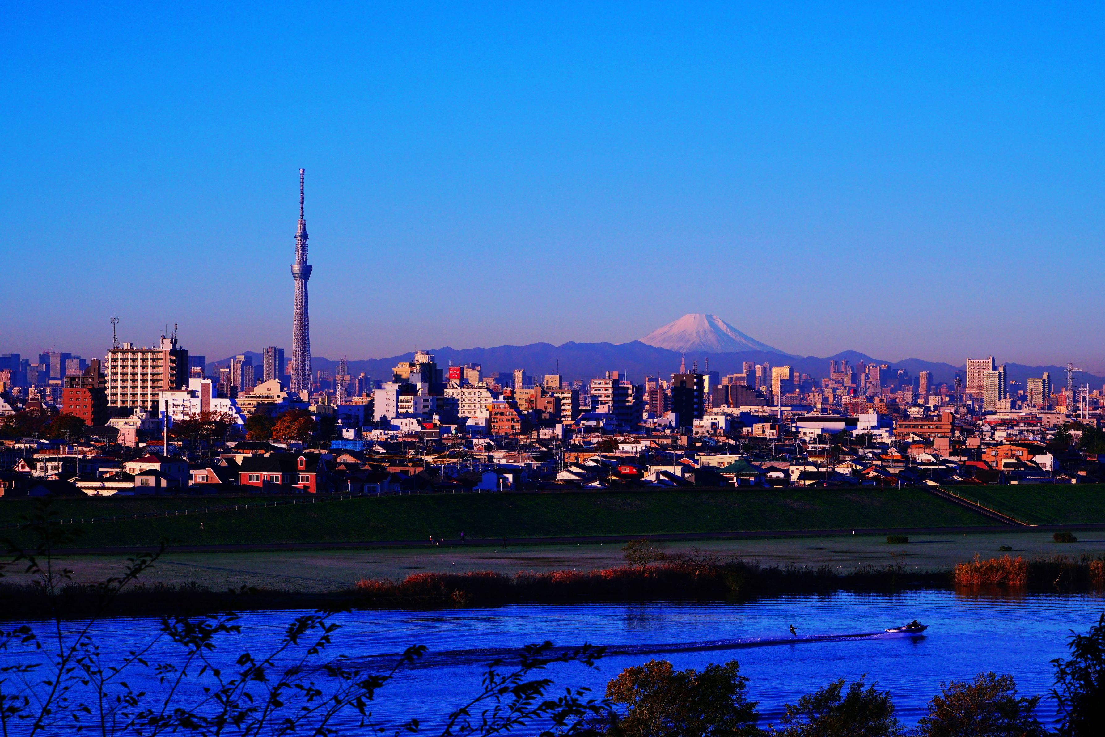 里見公園から早朝の富士山とスカイツリー、蔵出し