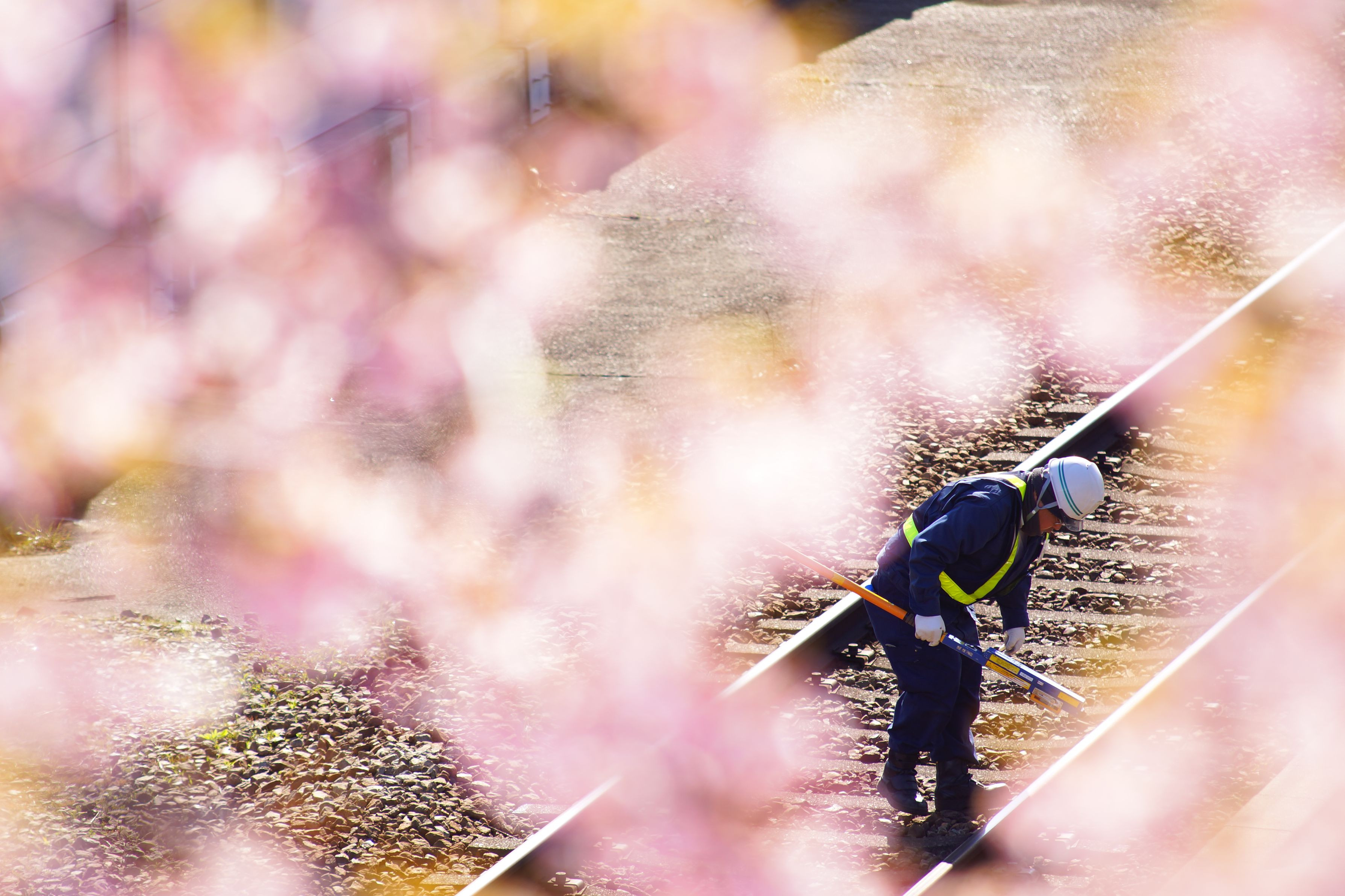 河津桜にはまもくれずレールを見守る保線マン