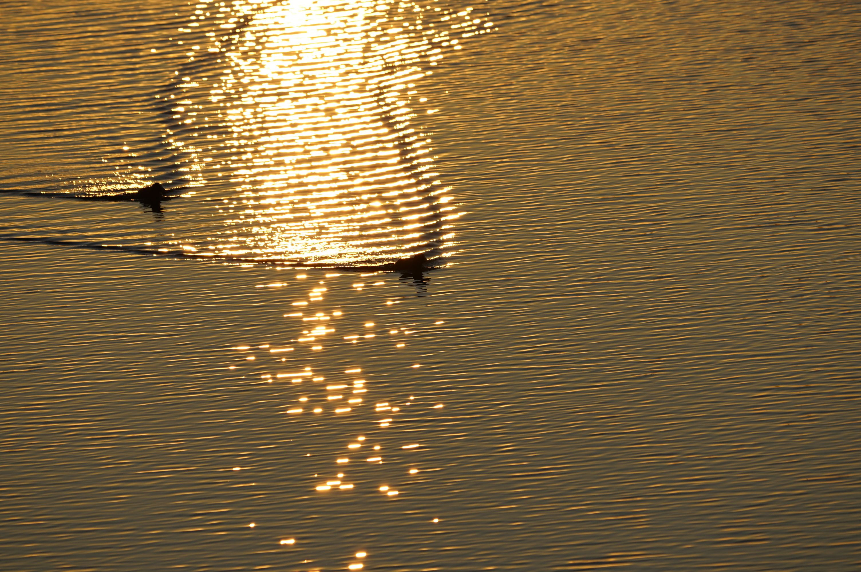 夕日を背に 二羽のオオバンが泳いで来ます。波紋が金色に輝やいて綺麗でした。