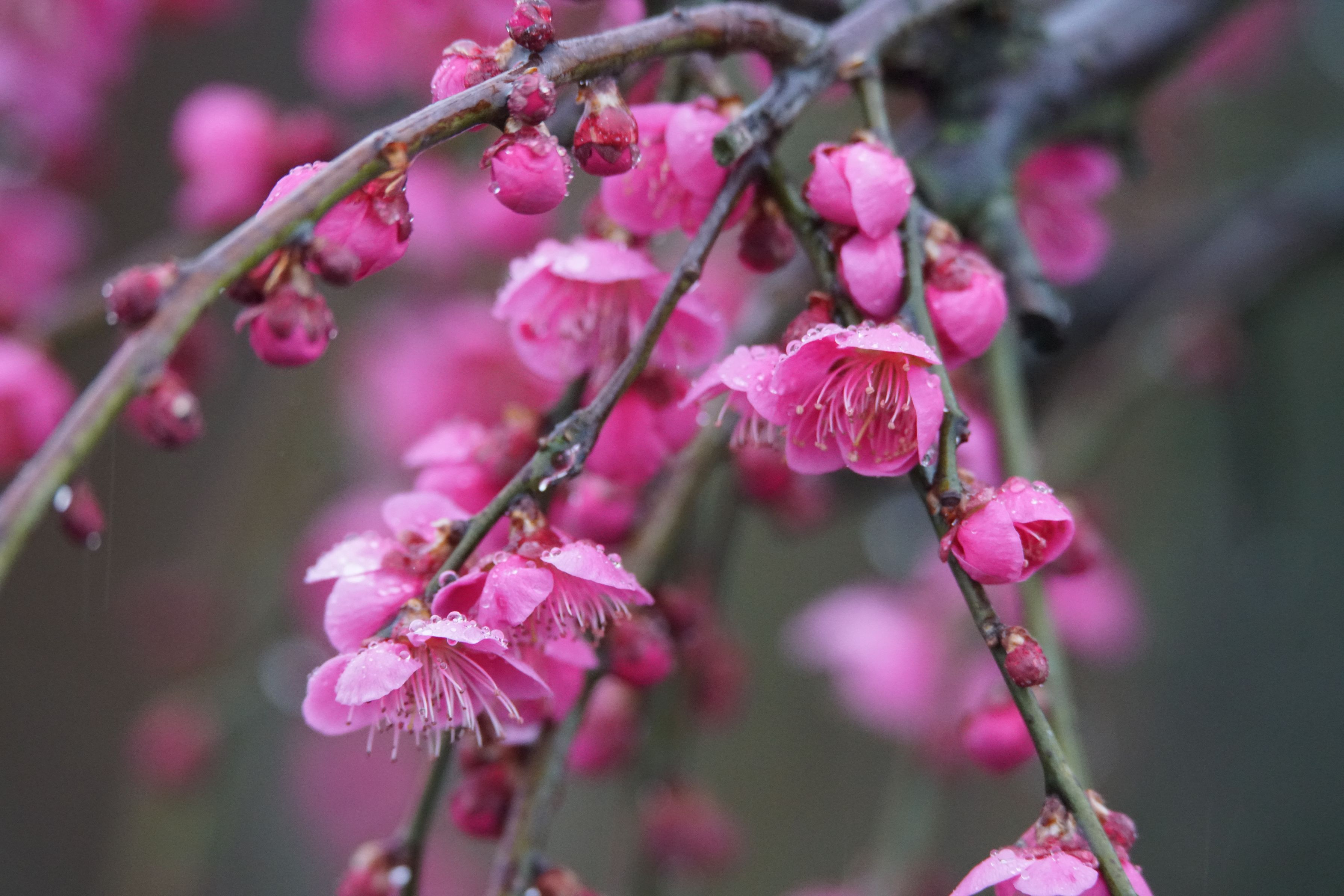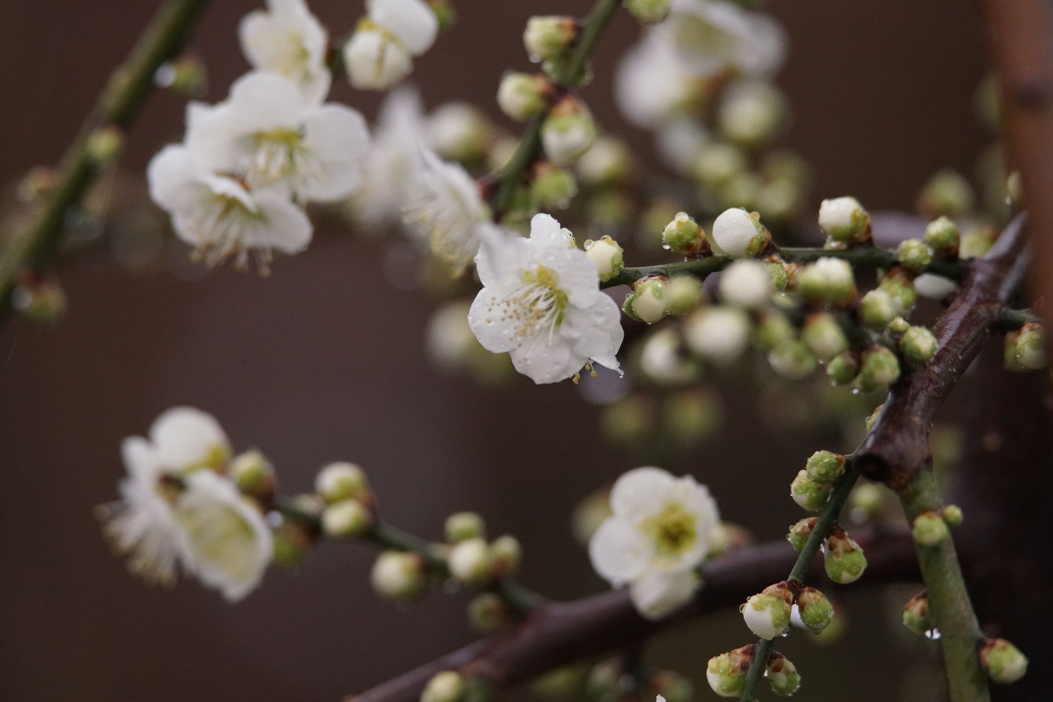 けさの散歩撮影は雨で暗く、鳥達も少なかったので、苗木畑の梅花を保険に撮ってきましたが、効ありでした。 α99Ⅱ、普段の鳥撮りではクロップモードばかりですが、ここではフルサイズで撮ってきました。