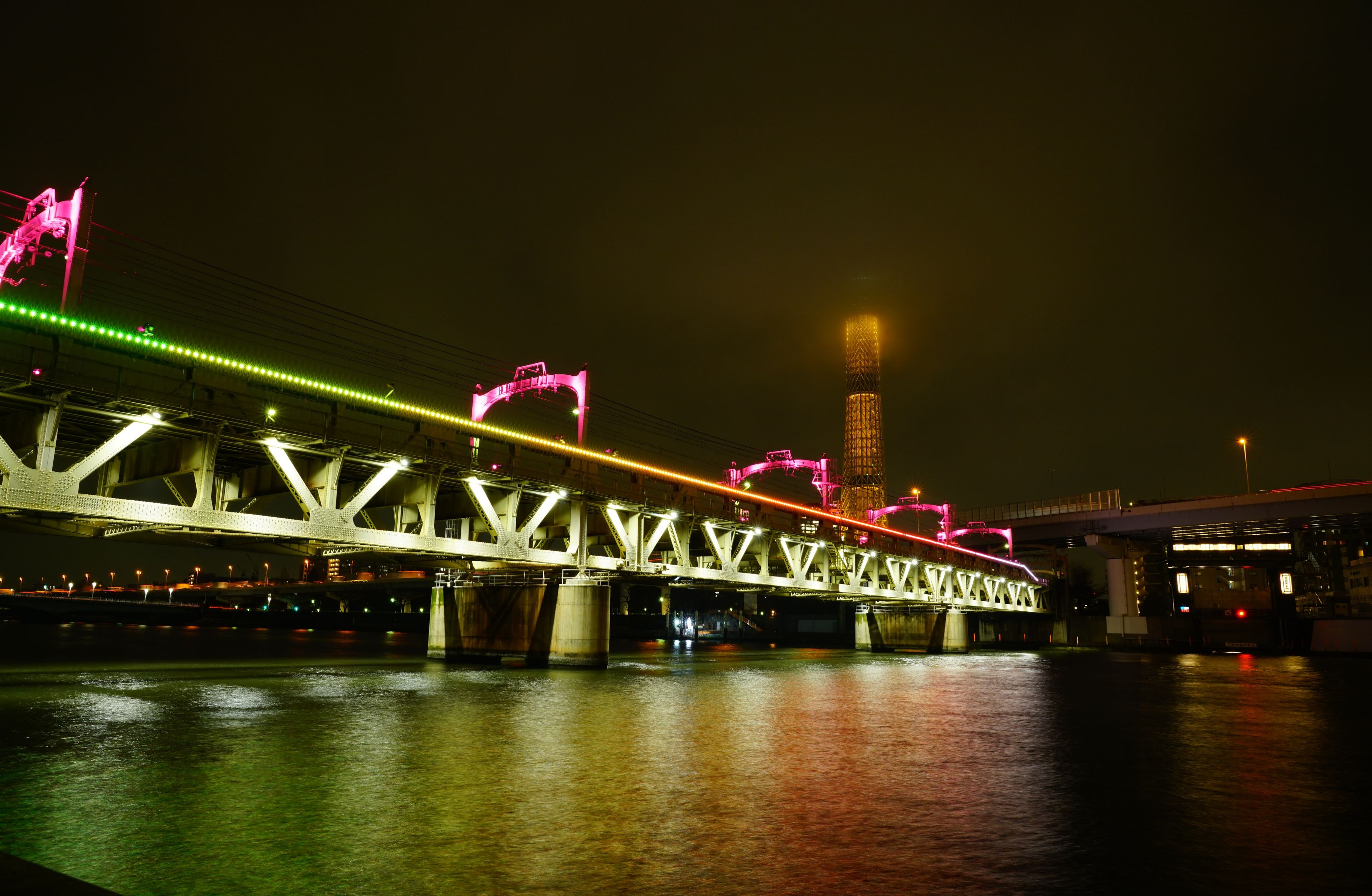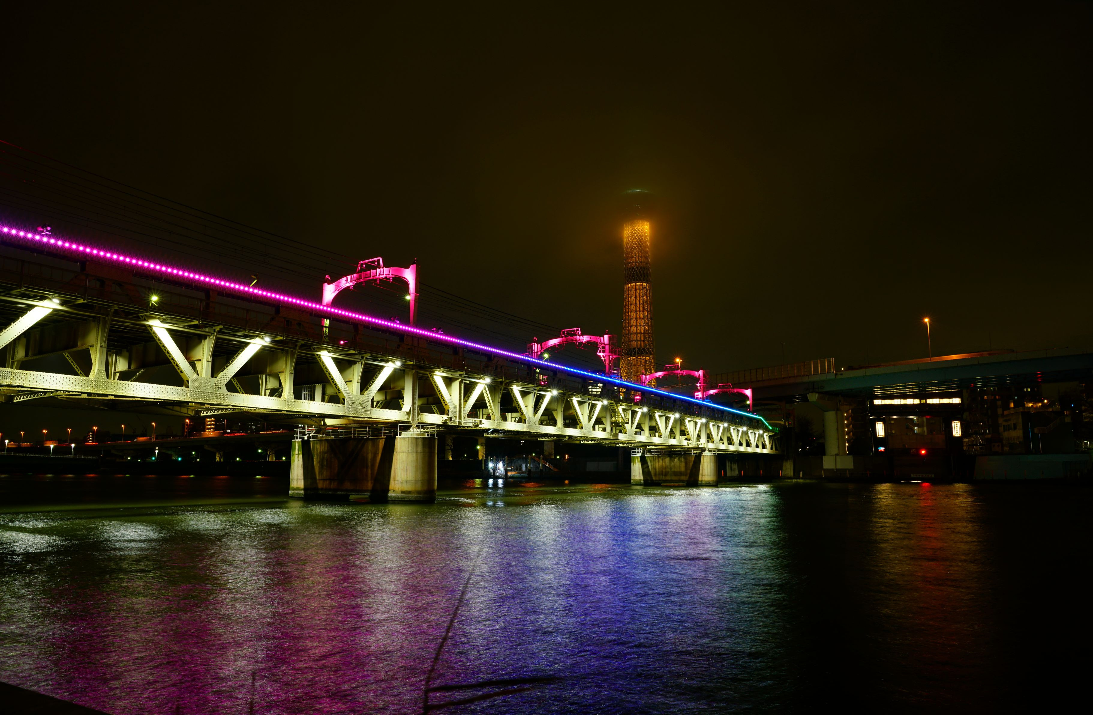 東武鉄橋の試験点灯と金色スカイツリーのPart 2。 色がグラデーションしていく演出でした。