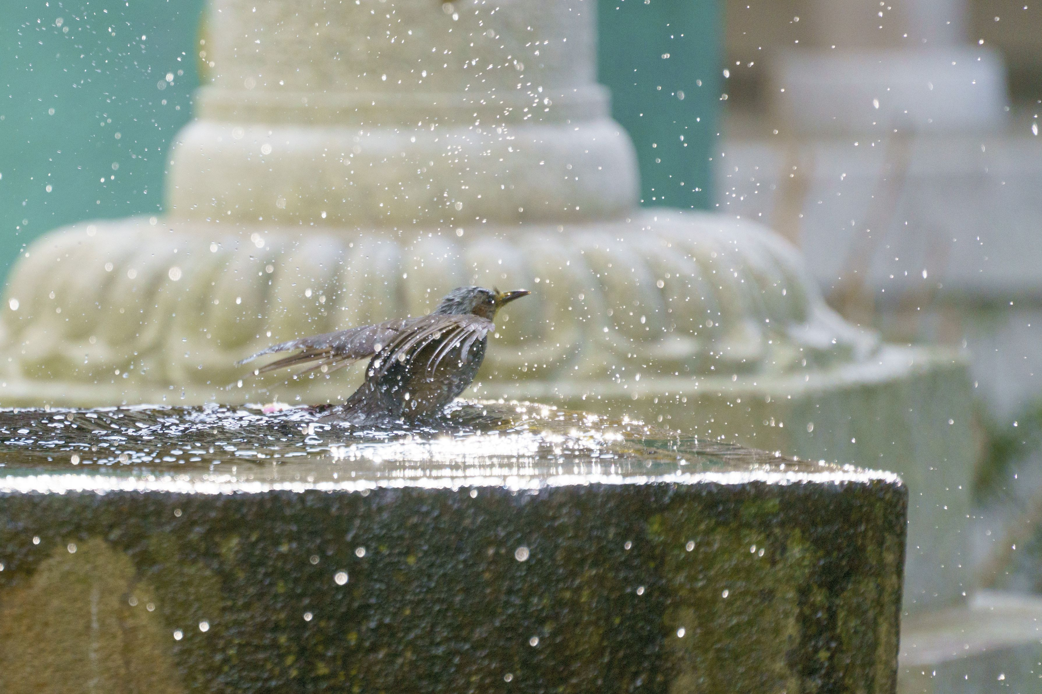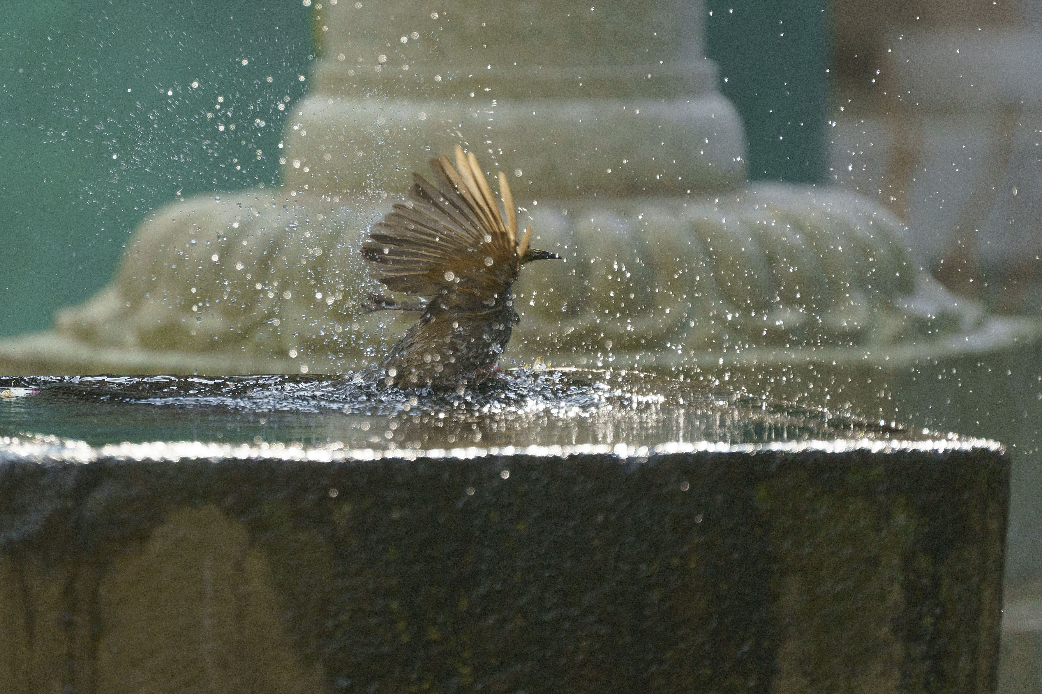 ヒヨドリの水浴び、バシャ、バシャ、バジャ