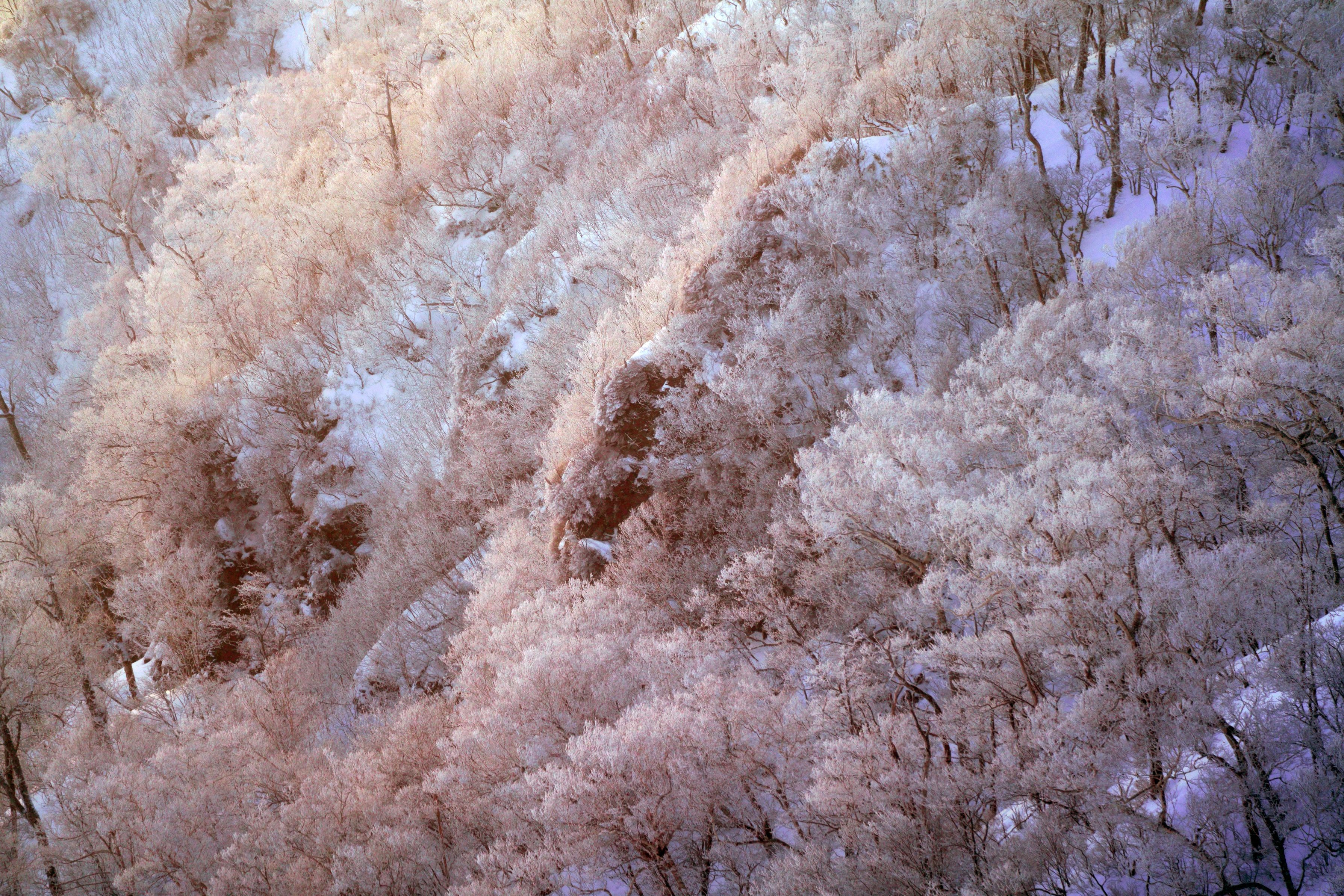 朝日に輝く木々。
