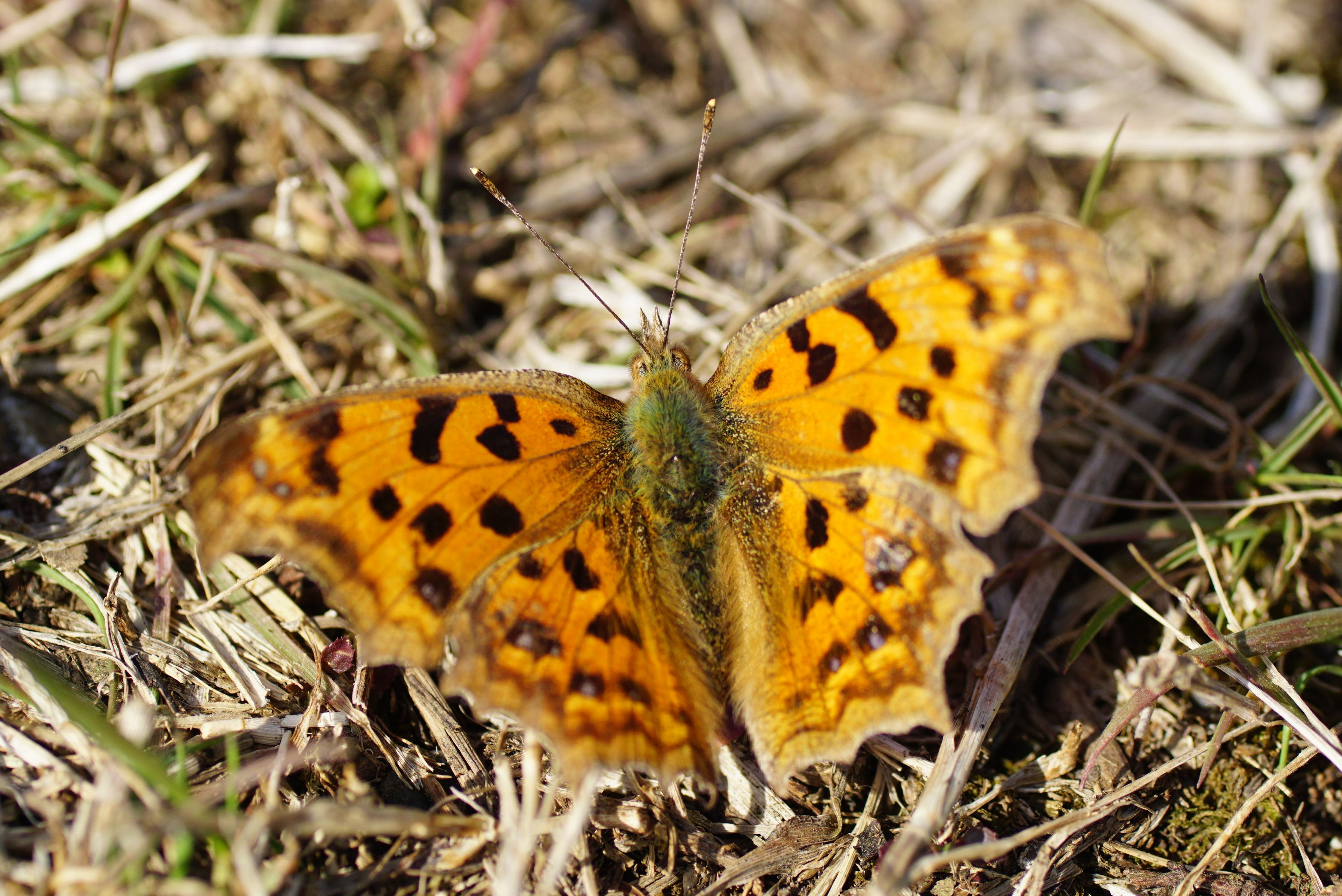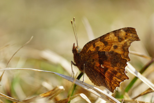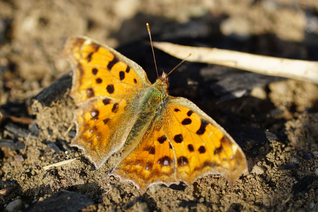 大型連休の頃の気温に達した撮影日。厳冬を乗り越えたキタテハが越冬から目覚め、気持ちよさそうに日向ぼっこです。