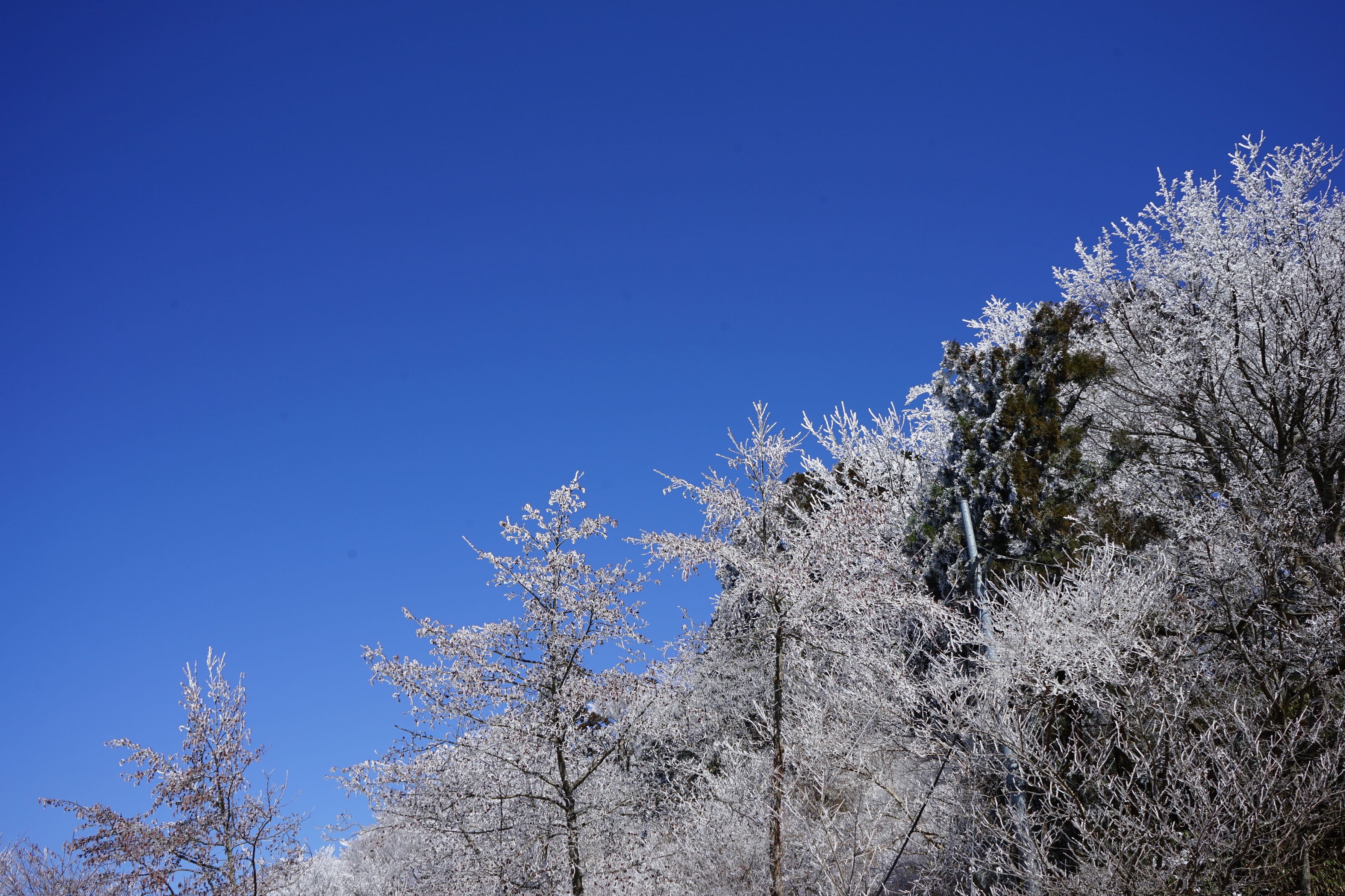 快晴のお天気で登山したら山頂付近で樹氷が見れてちょっと感激しました、写真撮影したら青空が印象的になり、綺麗な一枚に。