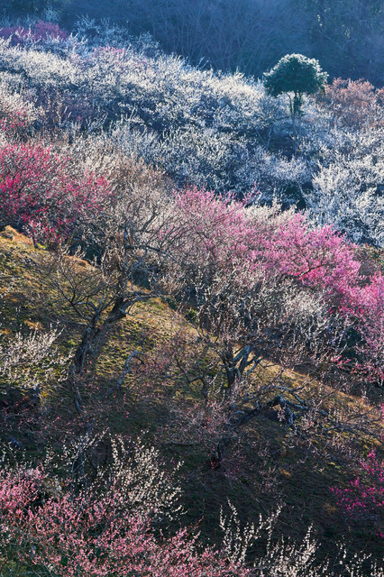 山間から差し始めた強い朝日に照らされる梅林の斜面です。紅梅白梅の満開時期が同じではありませんので良いタイミングを得るのが難しいです。また、もっと日が昇ってからのほうが良かったような気も。来年に引き続く課題、ということで。。。