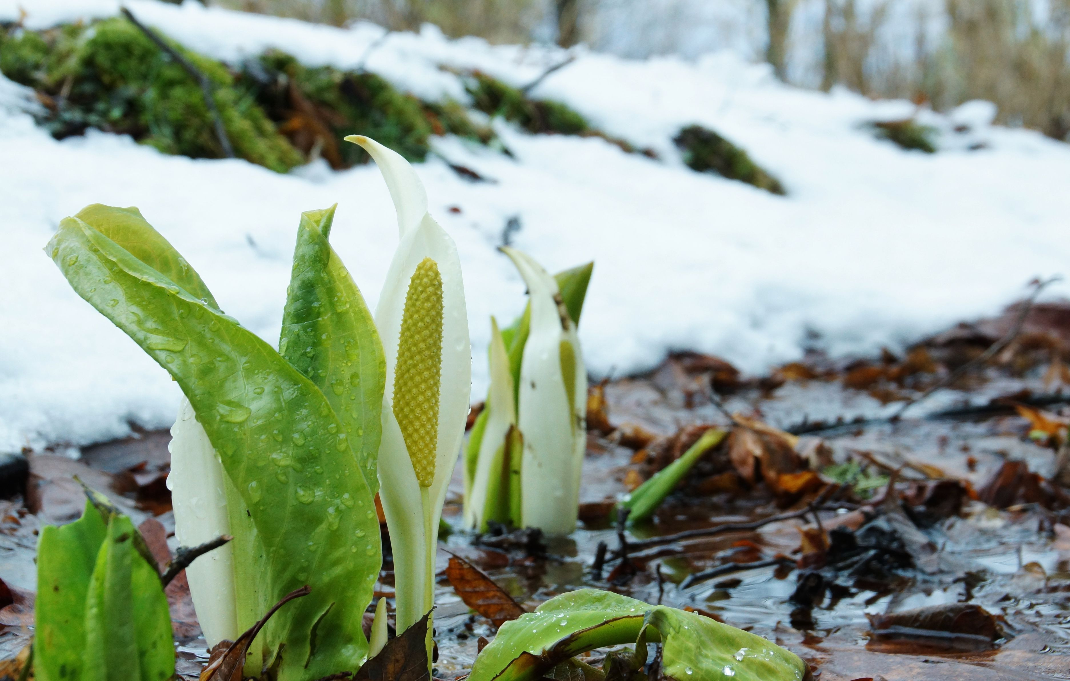 え!? と思うくらい早く水芭蕉が開花しました。 10日前には5㎝ほど、雪の中になんとなんとでビックリです(^^;)