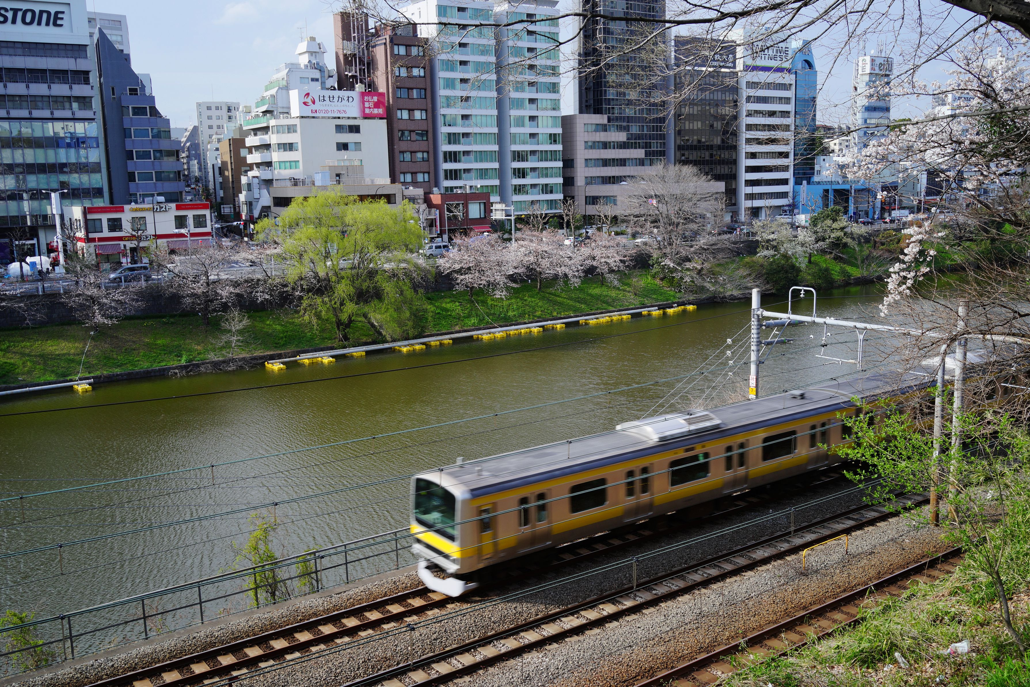 今日、靖国神社の桜が満開の発表があったそうですね。千鳥ヶ淵の桜はまだ少し早かった感じです。 帰りに線路沿いを歩いていたら、ちょうど総武線が撮れました(^^)/。
