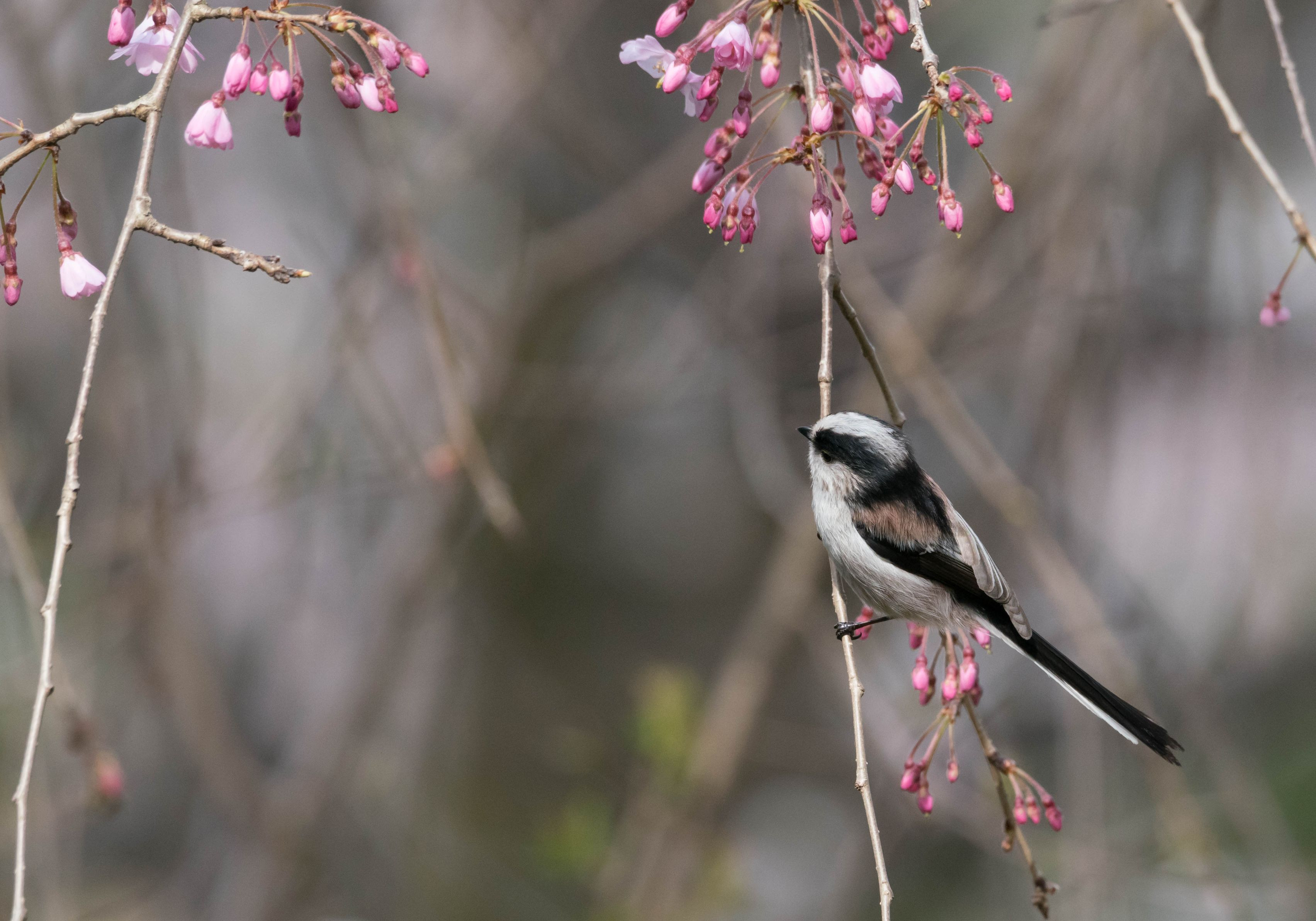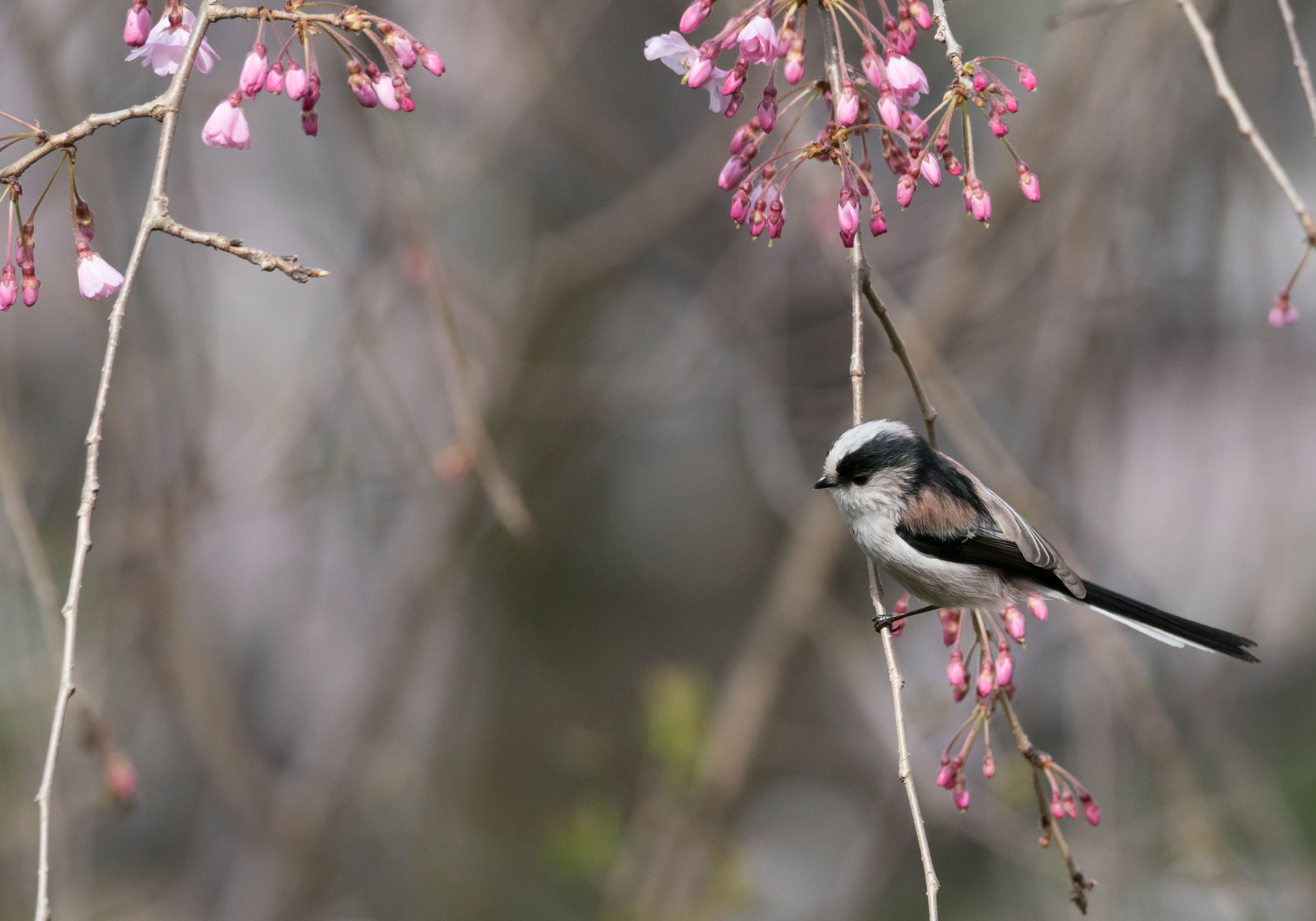 枝垂桜にやってきたエナガちゃん。 明日は咲いていると思うからまた来てね。