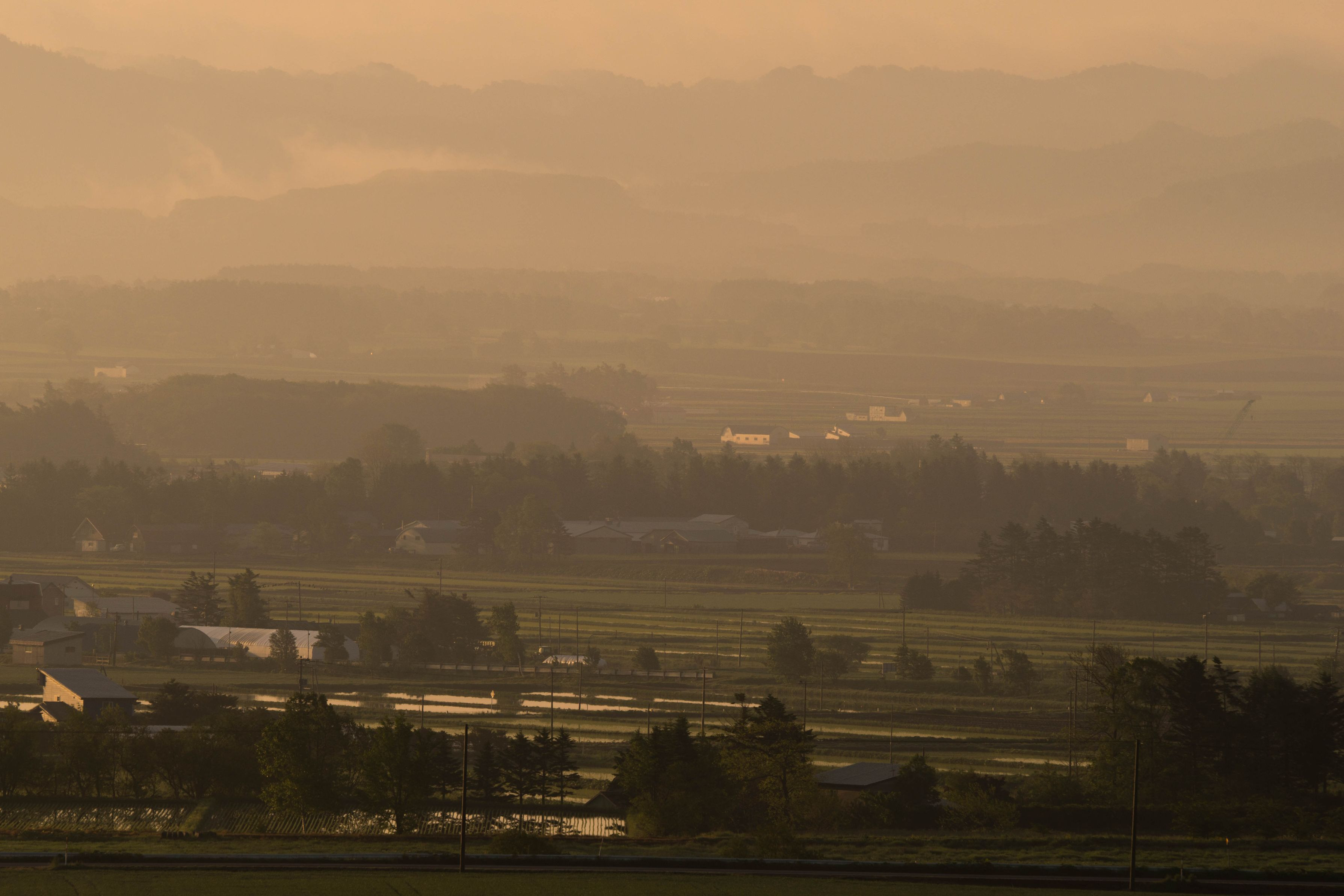 峠から朝もやの中に田園風景を望みました。