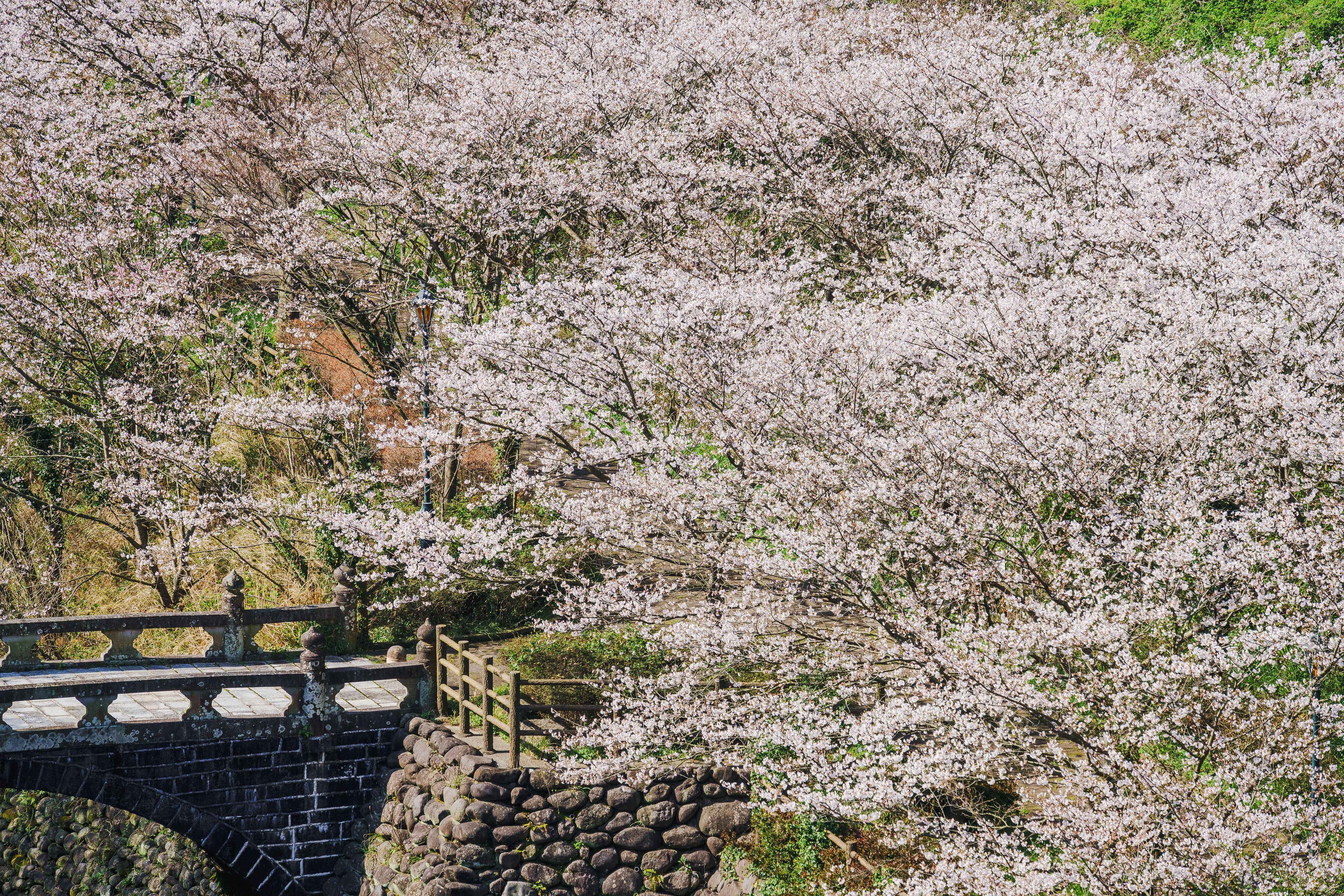 長崎市の西山ダムにて撮影。石橋や石造りのの門やらレンガやら、石系の絵になりそうなものと見事な桜があります。
