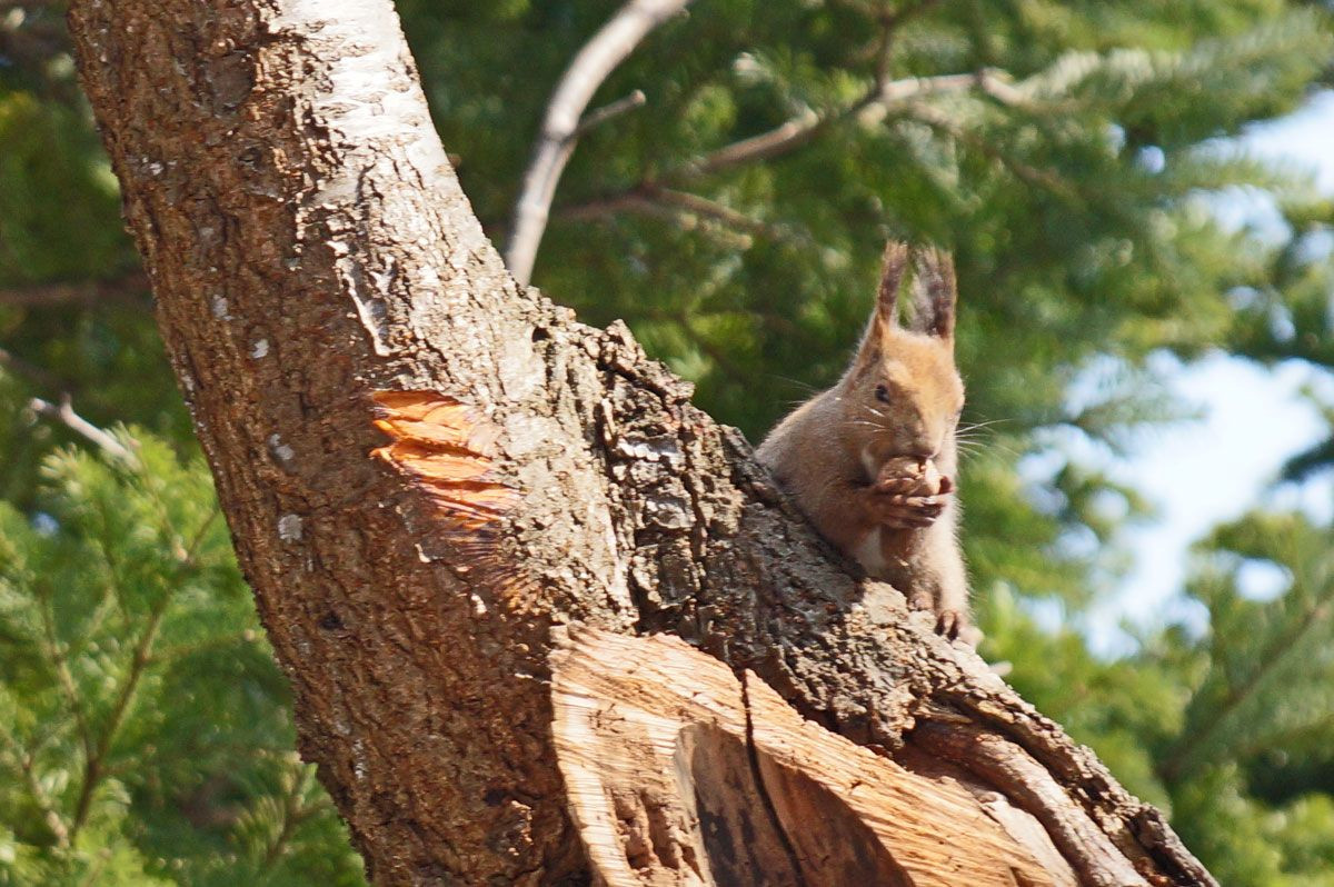 大木に穴があいている所にクルミなど運び冬に備えているようで 残りを食べているのでしょ~