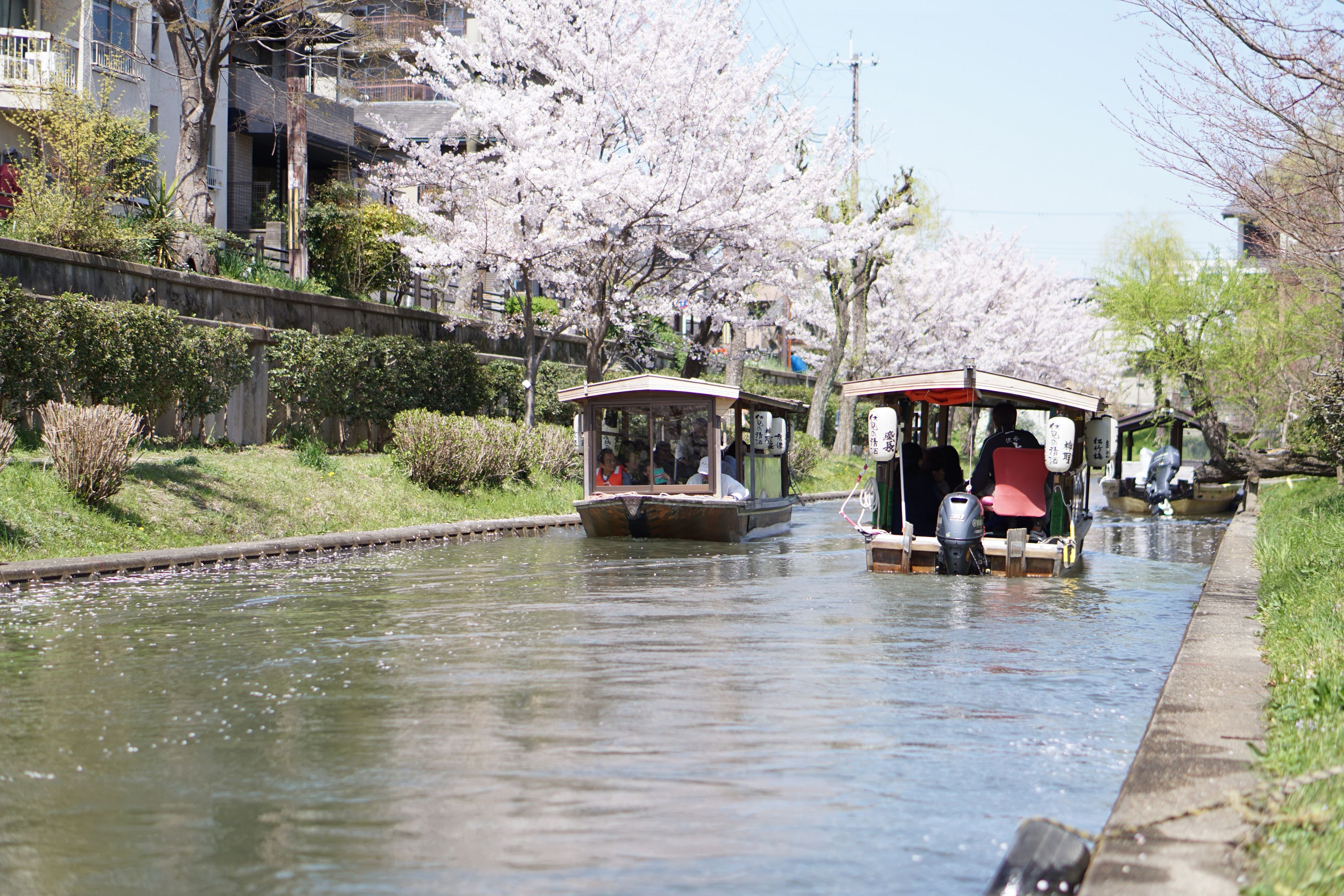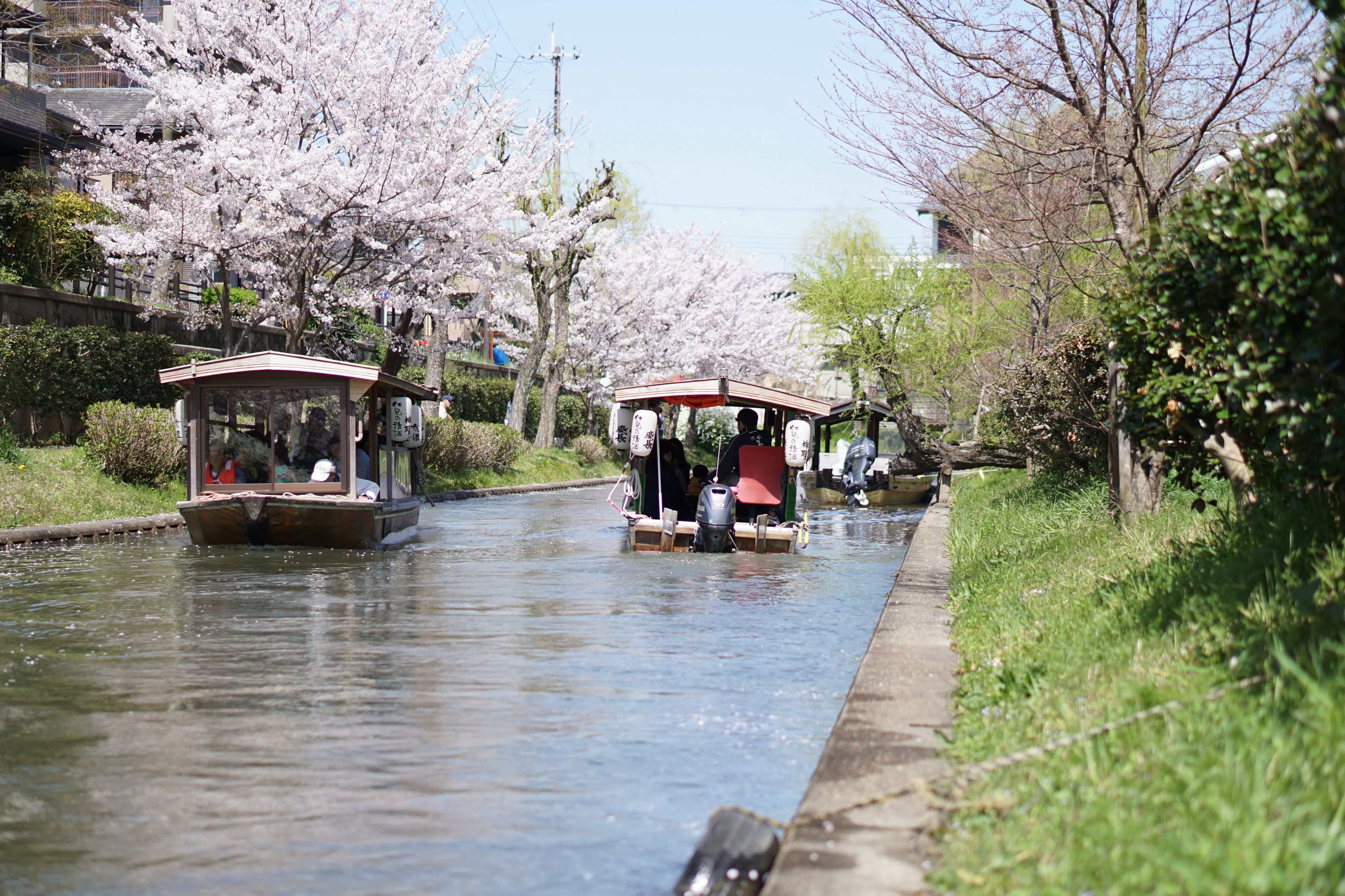 舟が行き交う所を撮りました。舟の料金は大人1,200円、子供600円、幼児300円です。