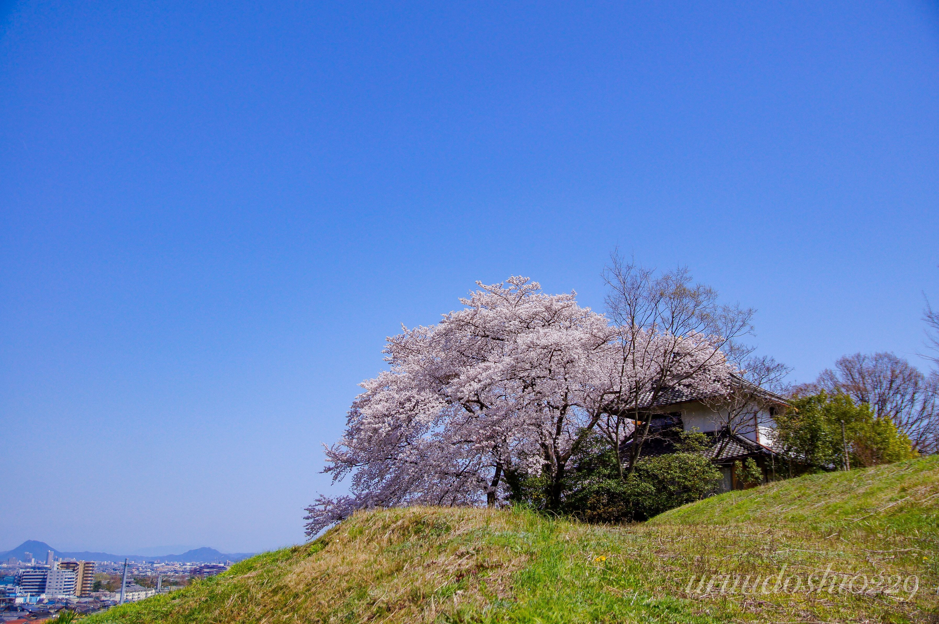 地元でもあまり知られていない見事な桜の木。 街を見下ろす高台で今年も立派に咲いていました。