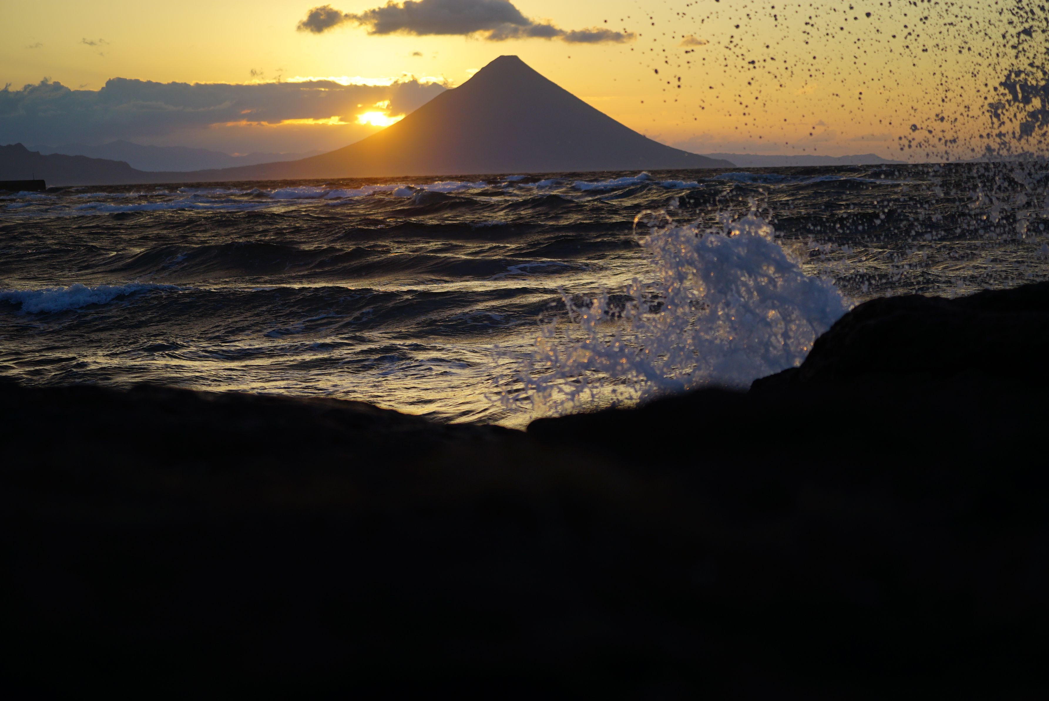 風がとても強い日でした。 カメラの先生と一緒に撮りに行ってようやく取れたものです。 とても楽しかったな~ 山は薩摩富士と言われる開聞岳です。 正月の初日の出では、ダイヤモンド開聞岳も撮れるとのことだったので、来年チャレンジを狙います。