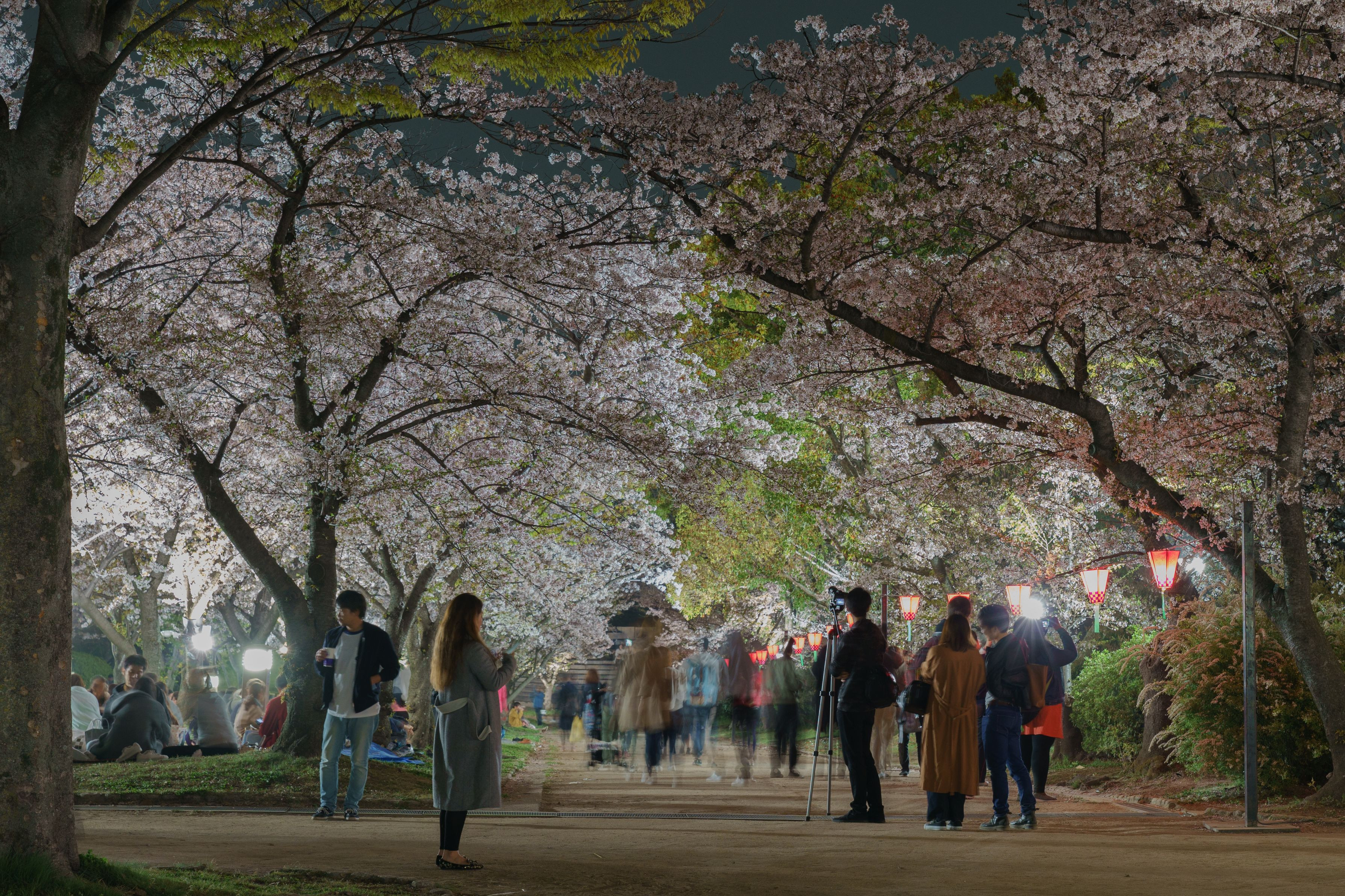 思い思いのスタイルで夜桜をたのしむ人々です@大阪城公園