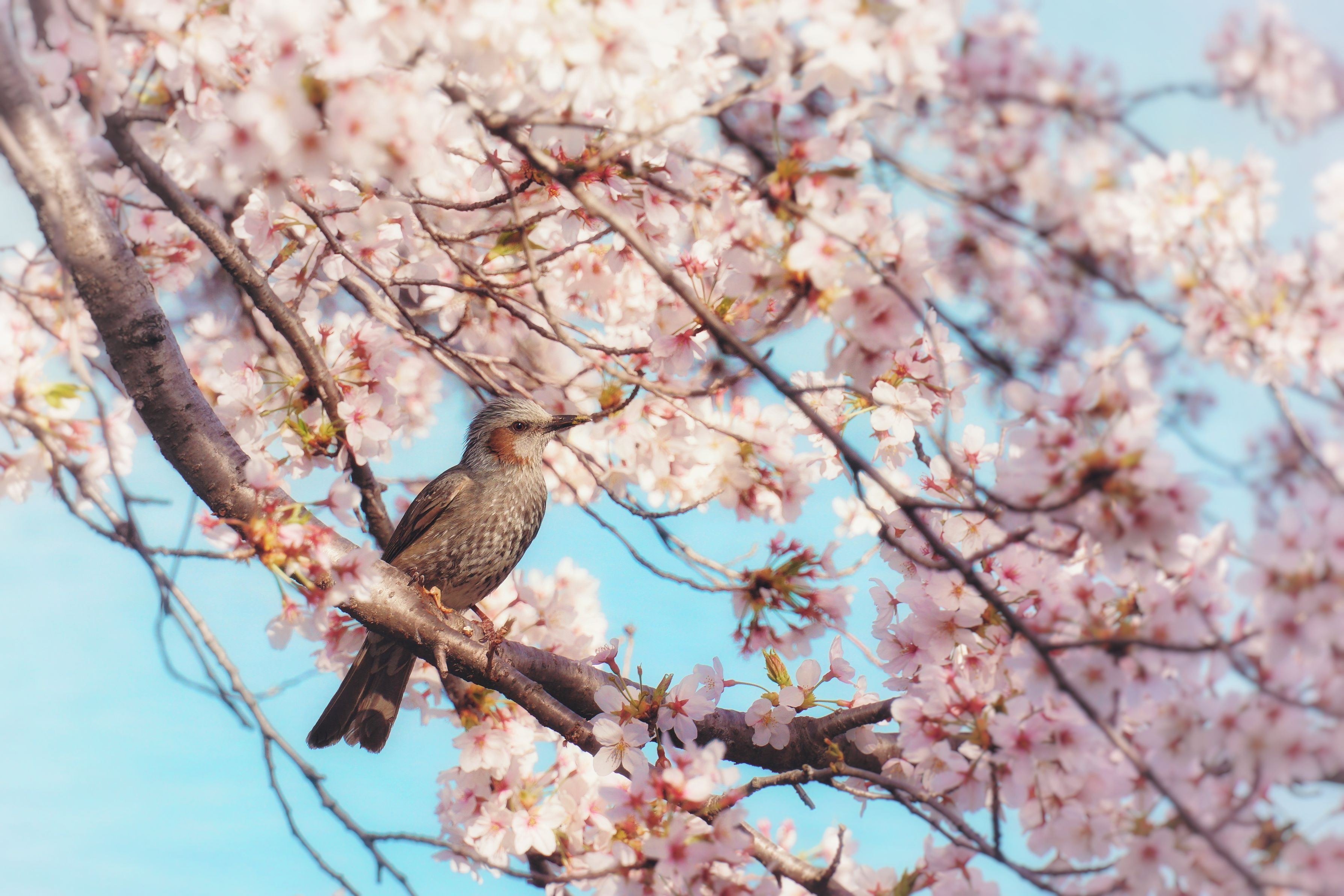 青空に映える桜がとても美しく、そこにヒヨドリがやってきたので頑張って撮った一枚です😌