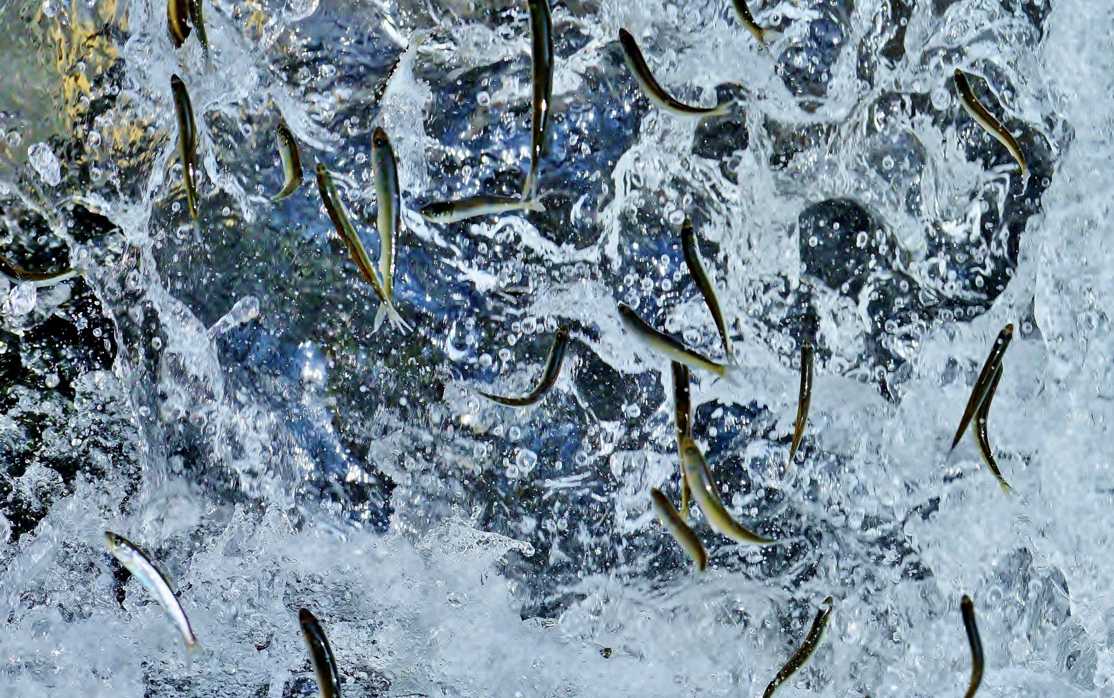 堰の魚道をジャンプして上る稚鮎。連写、連写、連写。 メモリ容量満杯になり削除、削除、削除、残ったのは数枚でした。 トリミングしています。