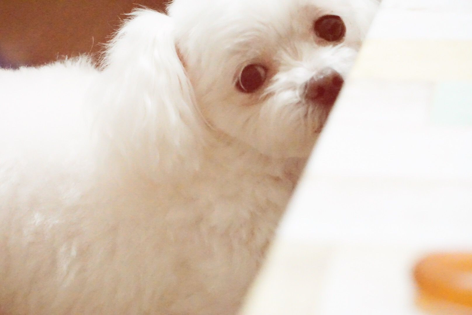 愛犬の活発な写真が撮れるようになりたいけれどまだ出来ないので、隠れるように見つめてくる様子を試しどり。携帯で加工をお試し。