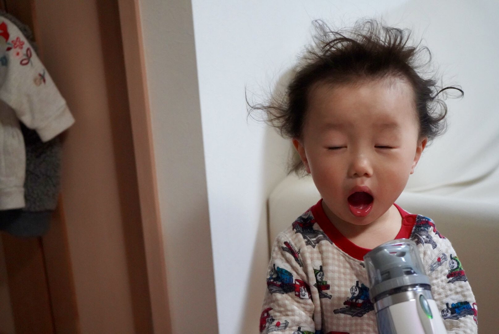 ドライヤーの風が苦手なのですが、なぜか自分から顔に風を当てたがります。 そして、何が嬉しいのか、イヤーーー!と、喜びます。 よくわかりませんが、可愛いので良しとします。 そんなバカな親が撮った一枚です。