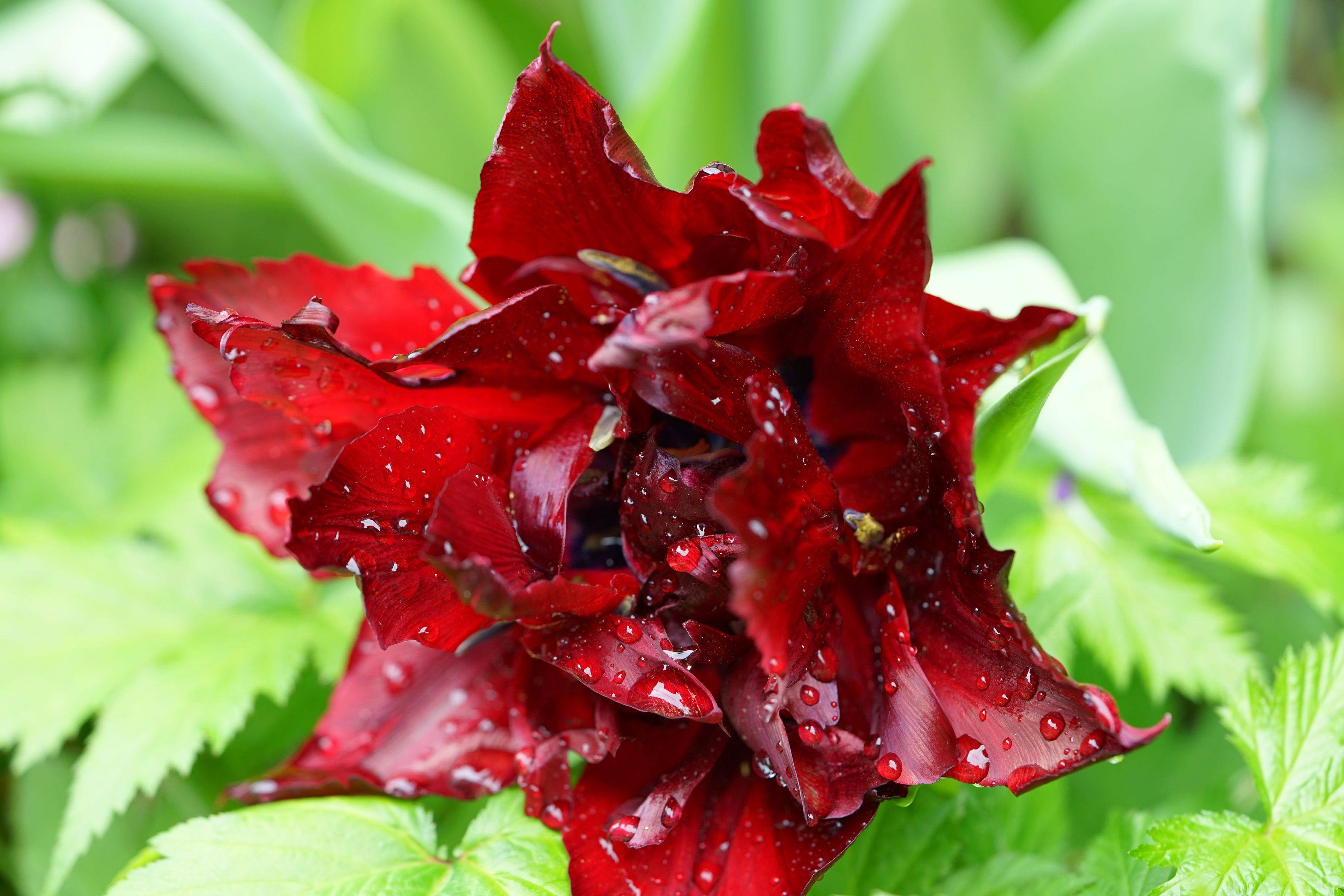 赤い花、雨にすっかり濡れて、艶やかさが増していました。