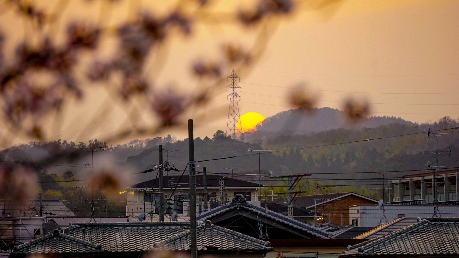 日本らしい瓦の屋根が多い住宅地の向こうにある山の下に太陽が隠れようとしているとこをパシャリ。