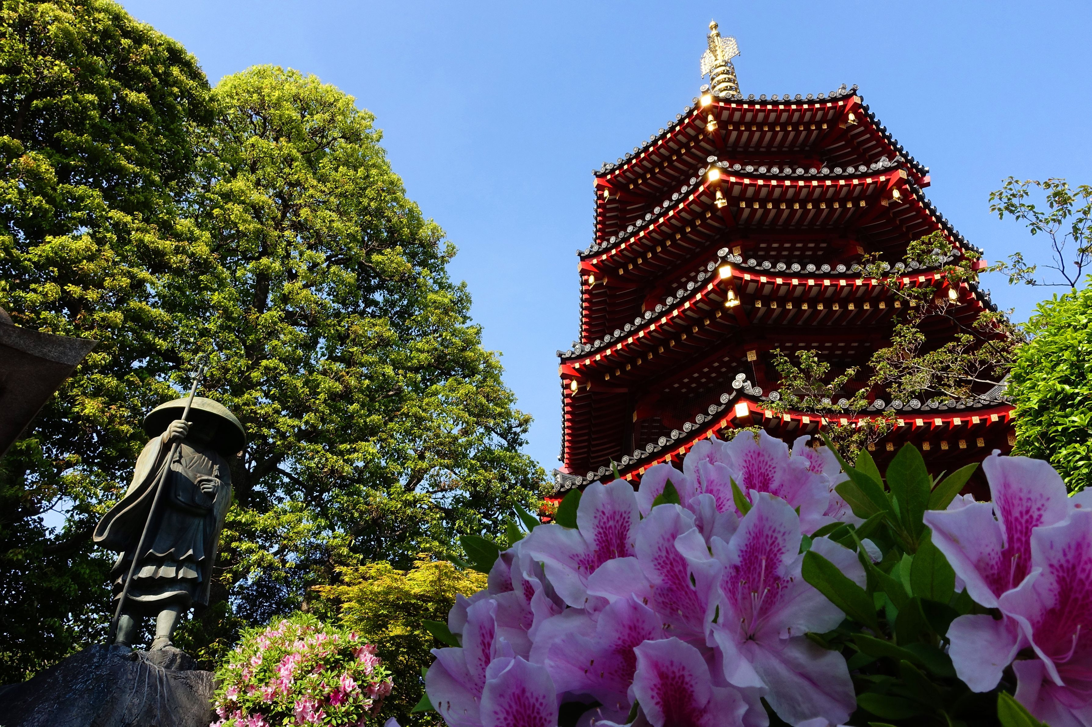川崎大師の境内にある八角五重塔を満開のツツジと一緒に撮影しました。