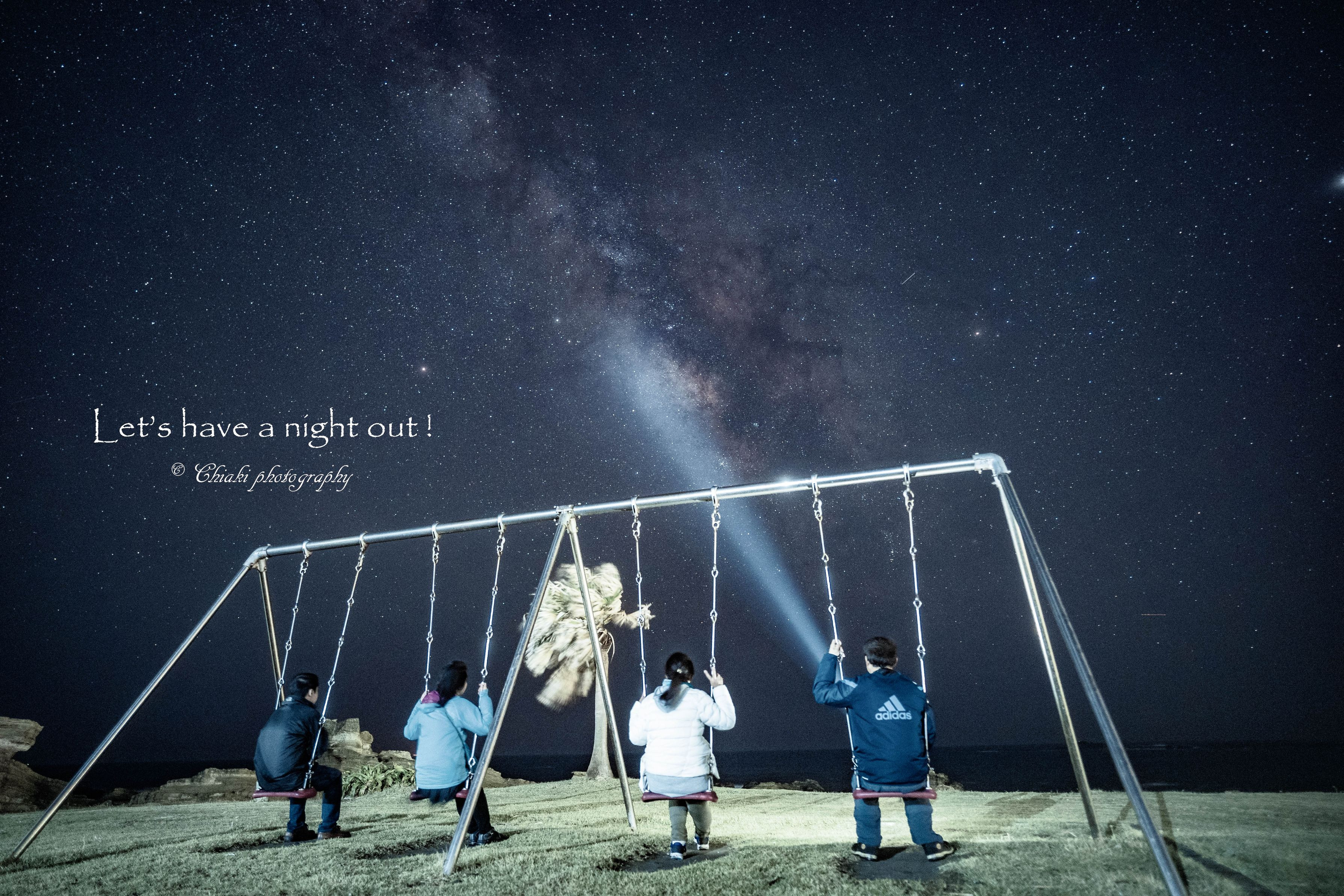 大人の夜遊び…ブランコに乗って天の川鑑賞!! 海の上に立ち昇る圧巻の天の川は、私たちを虜にしてくれました♡♡ 誰も居ない公園で、大人たちは星屑のようにキラキラでした~( *´艸`) 楽しかった~♪♪