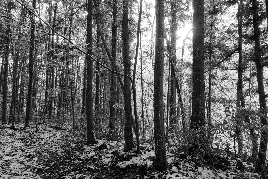 雪がキラキラと降り注ぐ森の中