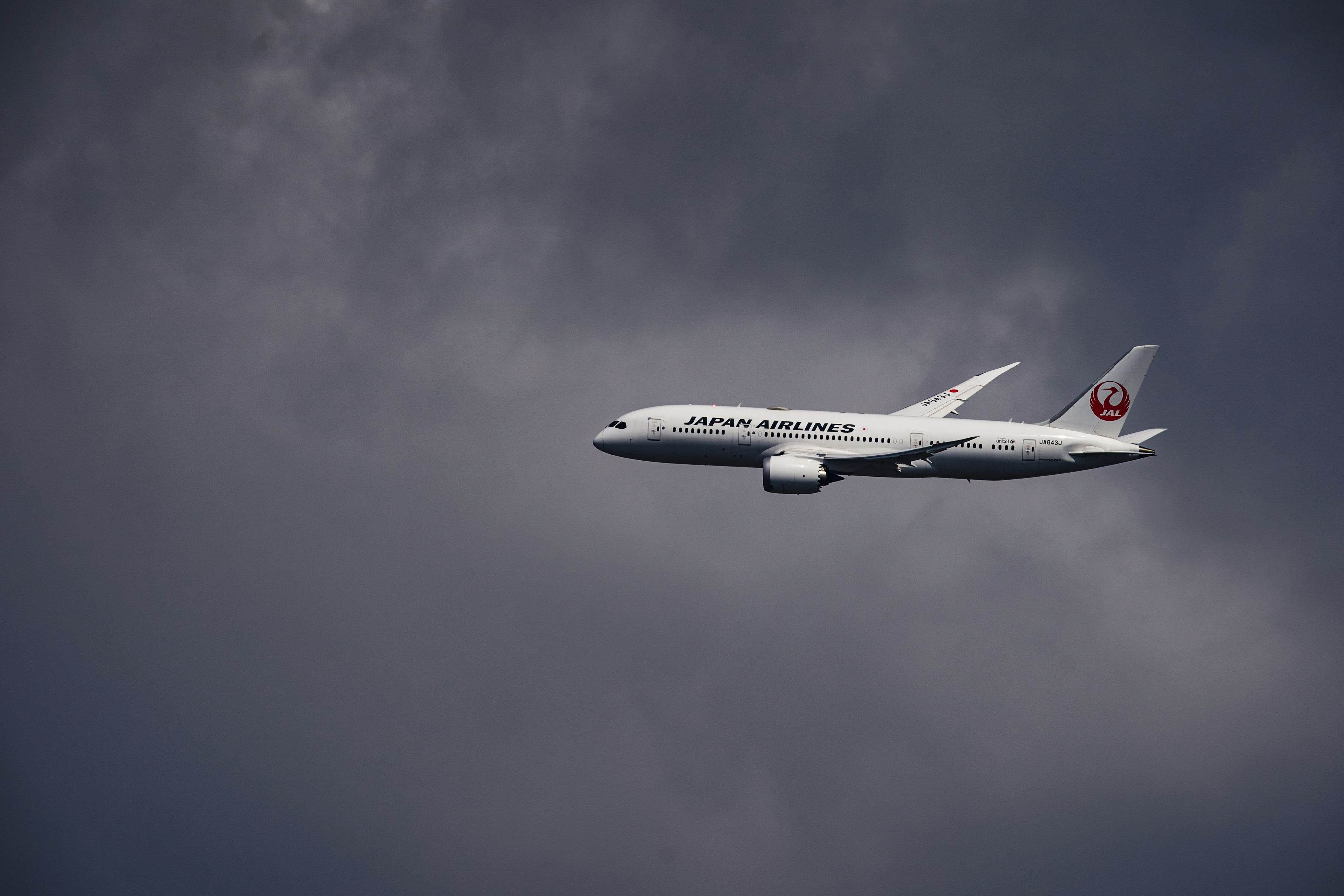 厚い雲と雲の間を飛行する787に日が差し、機体を浮かび上がらせました。