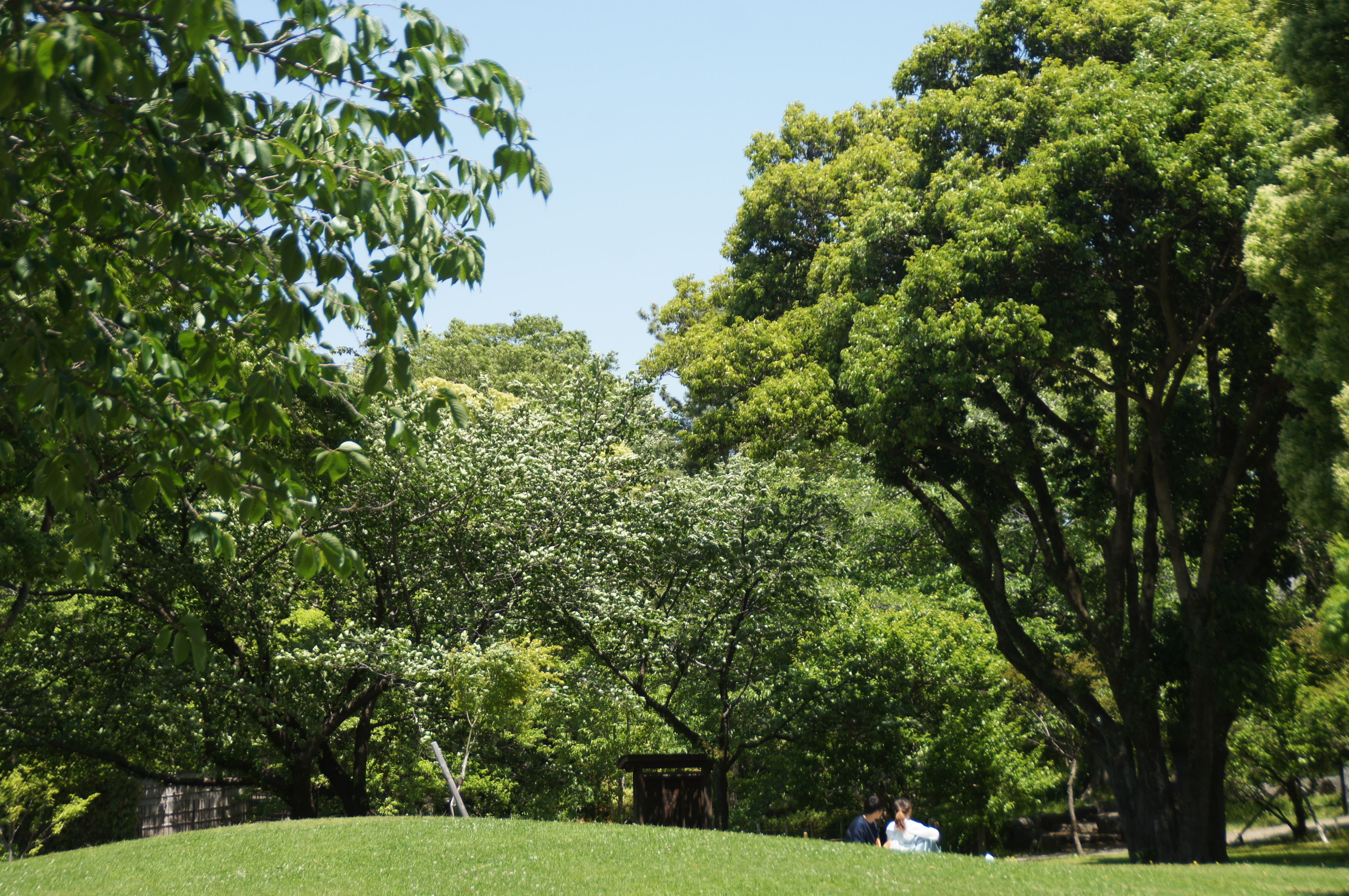 やわらかな陽射しが差し込む公園でくつろぐ恋人たち 緑に輝く木々に癒されます