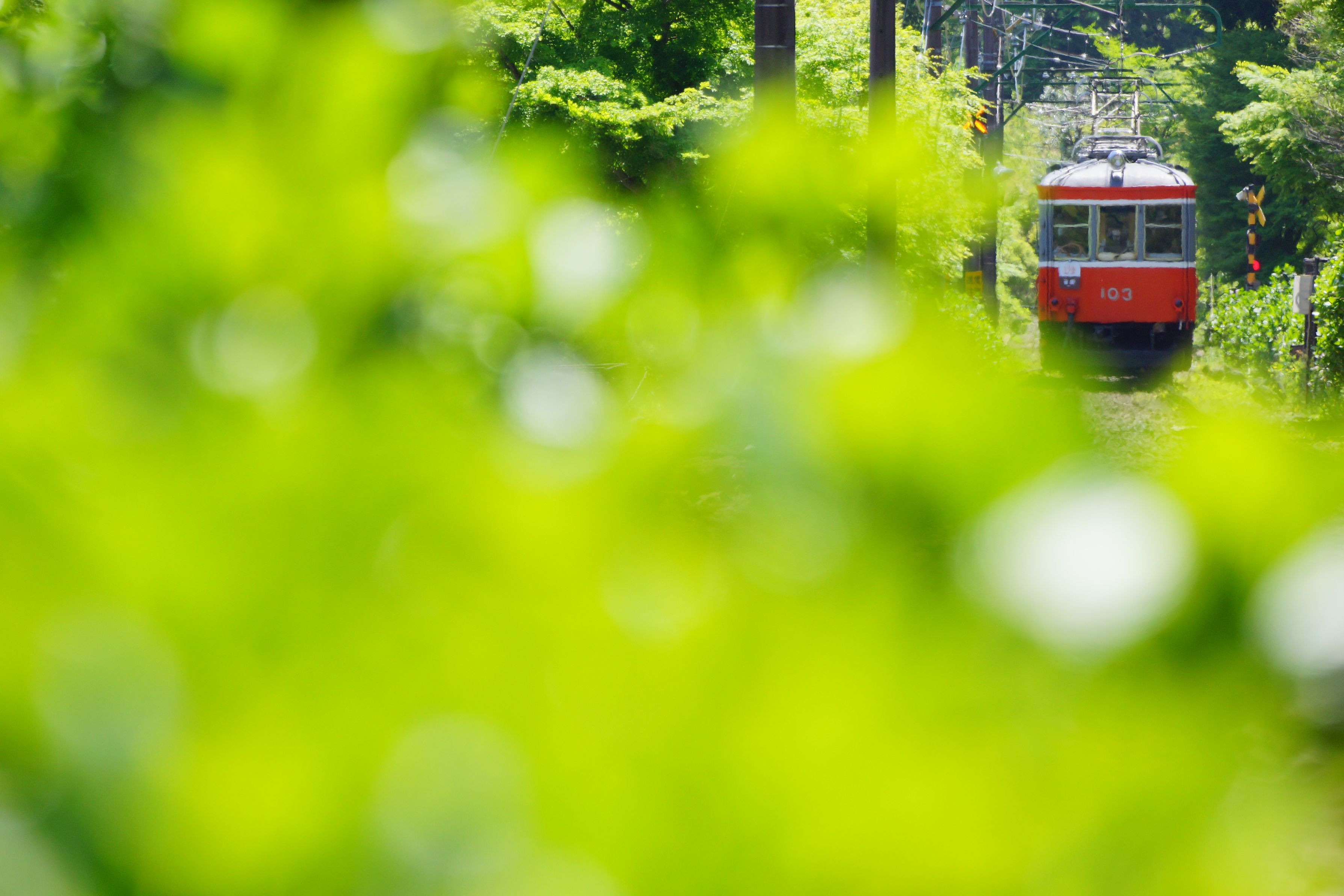 新緑の中を行く登山電車。 日差しはもう初夏のようでした。 #箱根登山鉄道# 小涌谷~彫刻の森