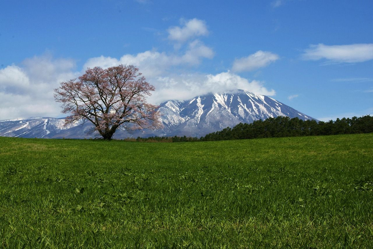 岩手山を背景に広大な農場に咲く一本桜。桜前線を追って、やっと捉えました。