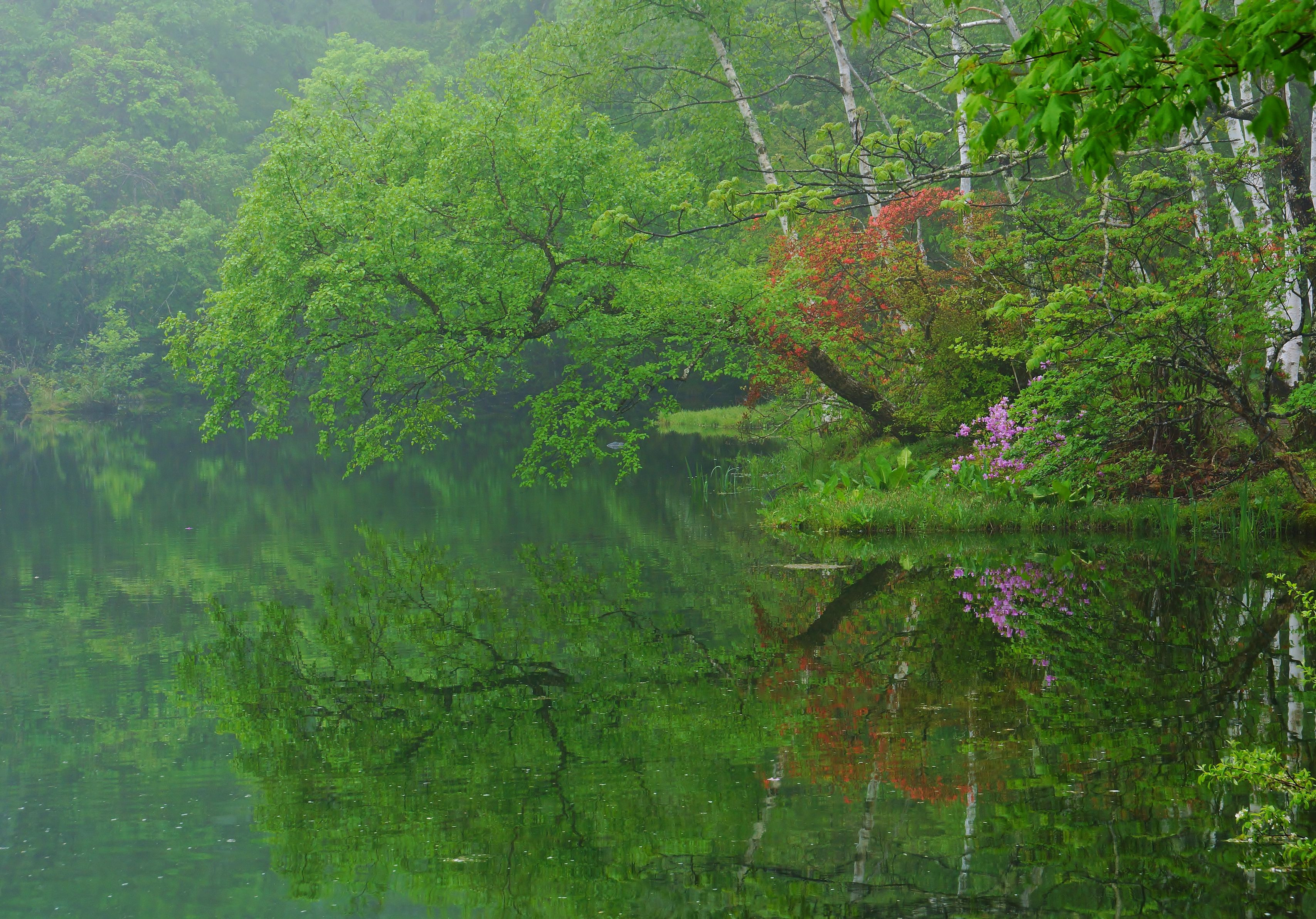 八千穂高原駒出池キャンプ場の雨上がり風景です。 水鏡に映り込んだツツジが綺麗でした。