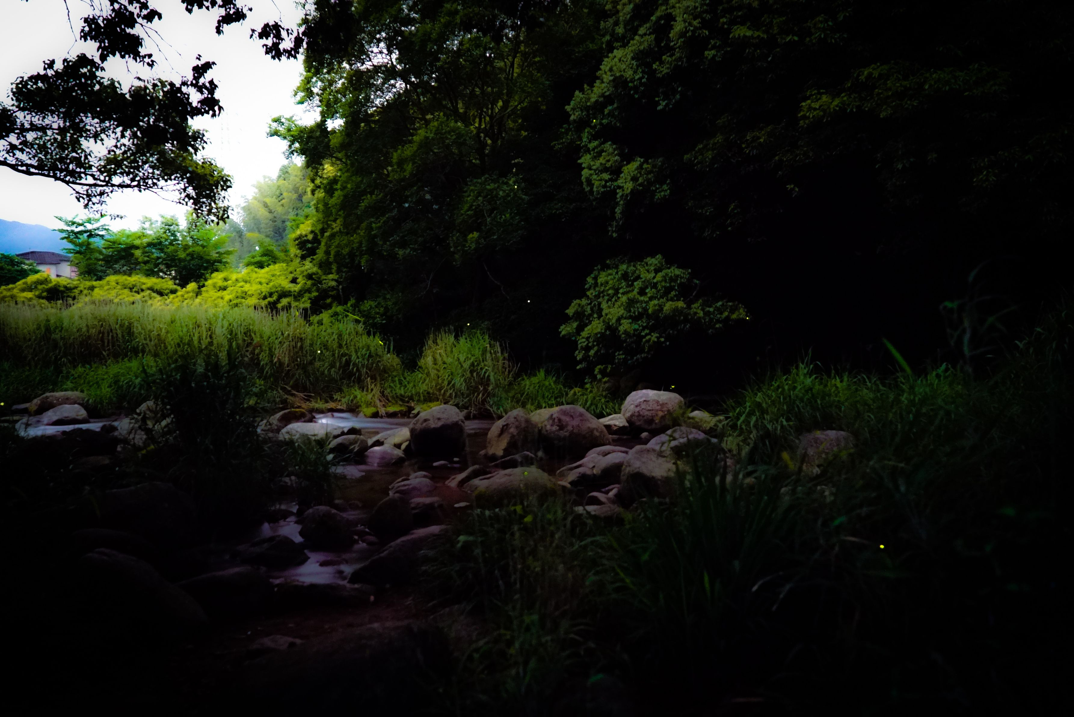 真っ暗な中MFの三脚使用で撮ってみましたが明るすぎて蛍が点になってしまいました。 蛍は難しいですね。