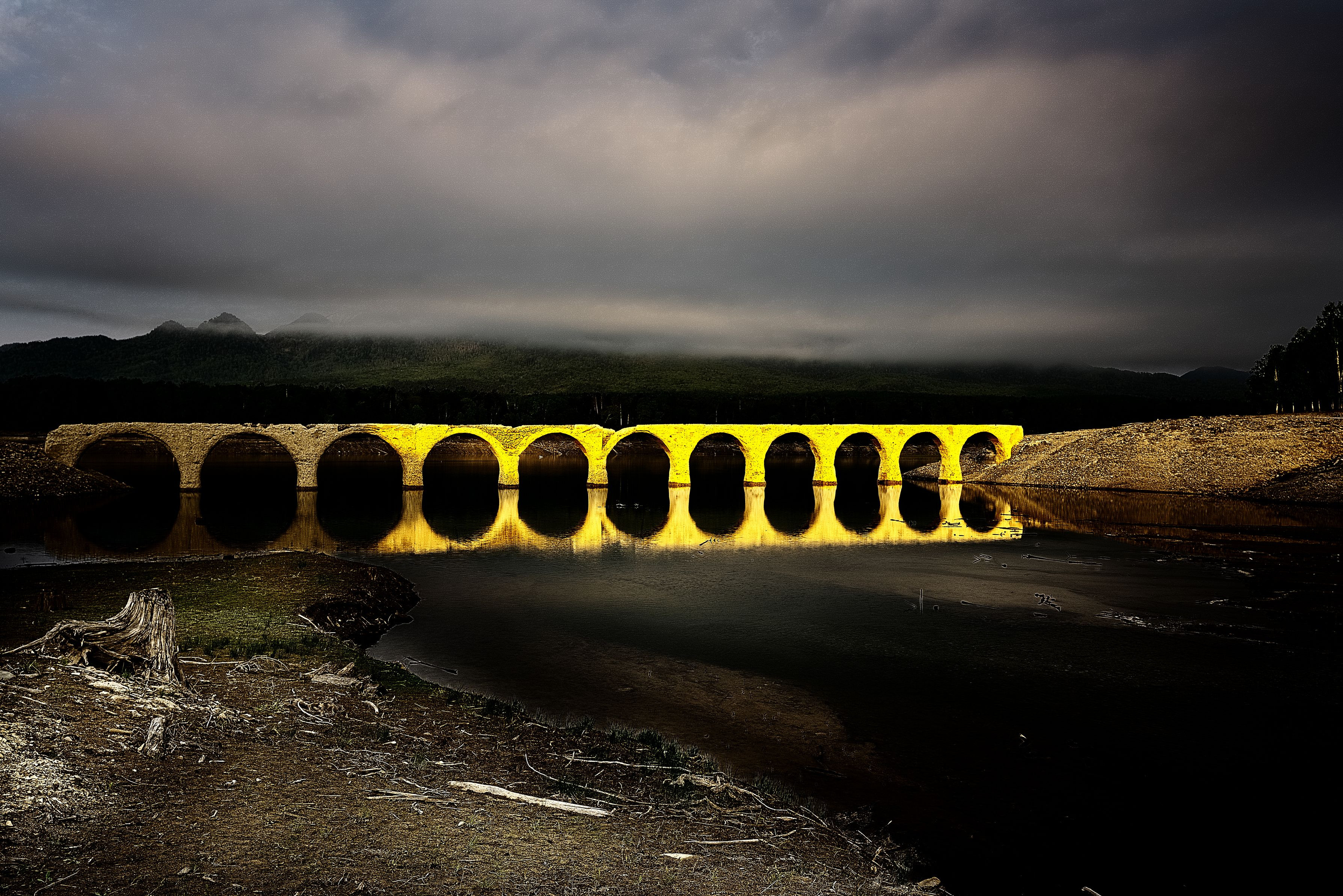 2018/6/2 上士幌町タウシュベツ川橋梁 α7RⅢ+FE 16-35mm F2.8 GM 東側の斜面に移動すると、ほんの数分だけ朝陽が橋梁を照らし金色に染まりました。(*^^)v 正面からも撮ろうと欲を出したのがいけなかったのでしょう。移動している最中にみるみる翳ってしまい、その後朝陽が顔を出すことはありませんでした。(T_T)