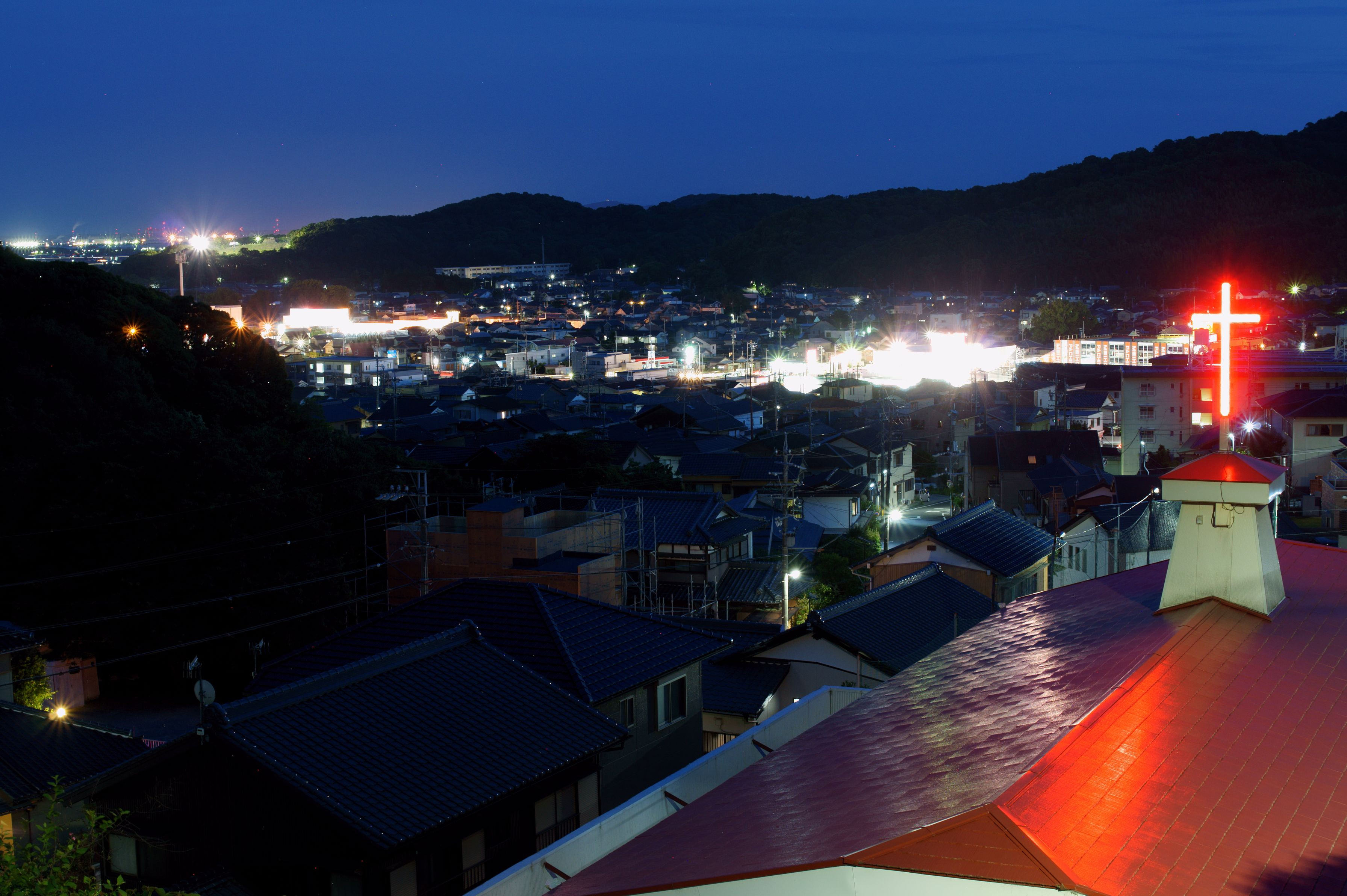豊川中央キリスト教会の屋根越しに御油の街並みの夜景を見ることができます。 レンズ:SONY DT 35mm F1.8