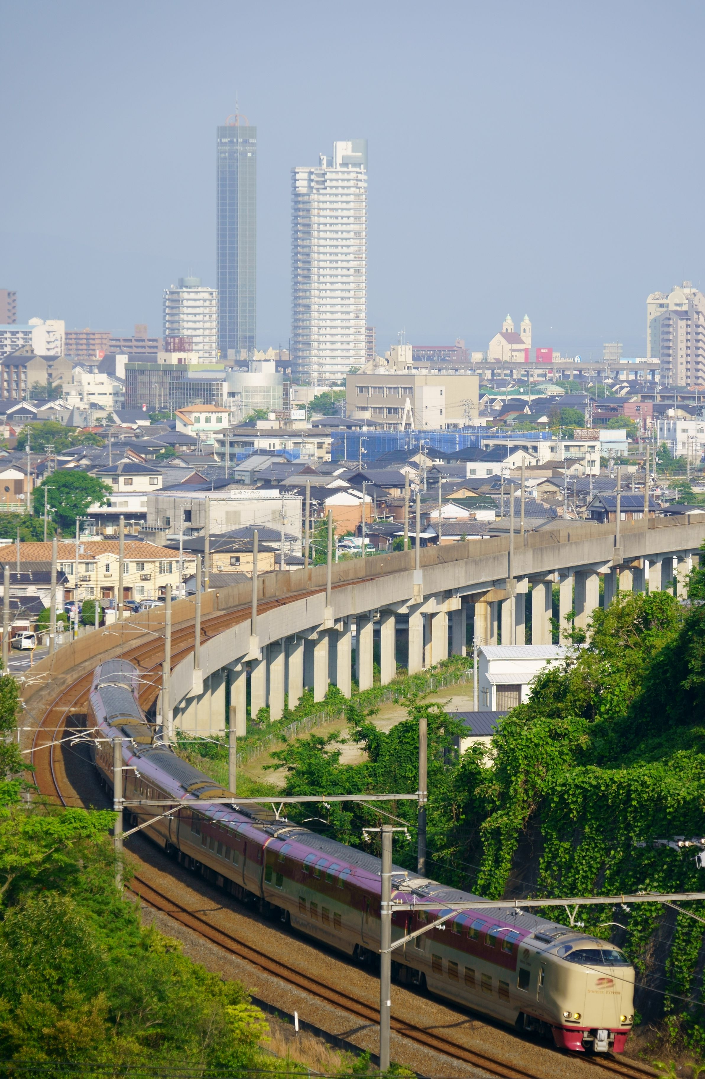 ゴールドタワーをバックにサンライズ瀬戸を俯瞰してみました。 天気は悪くなかったけどスッキリ晴れてなくて霞んでいて残念でした。