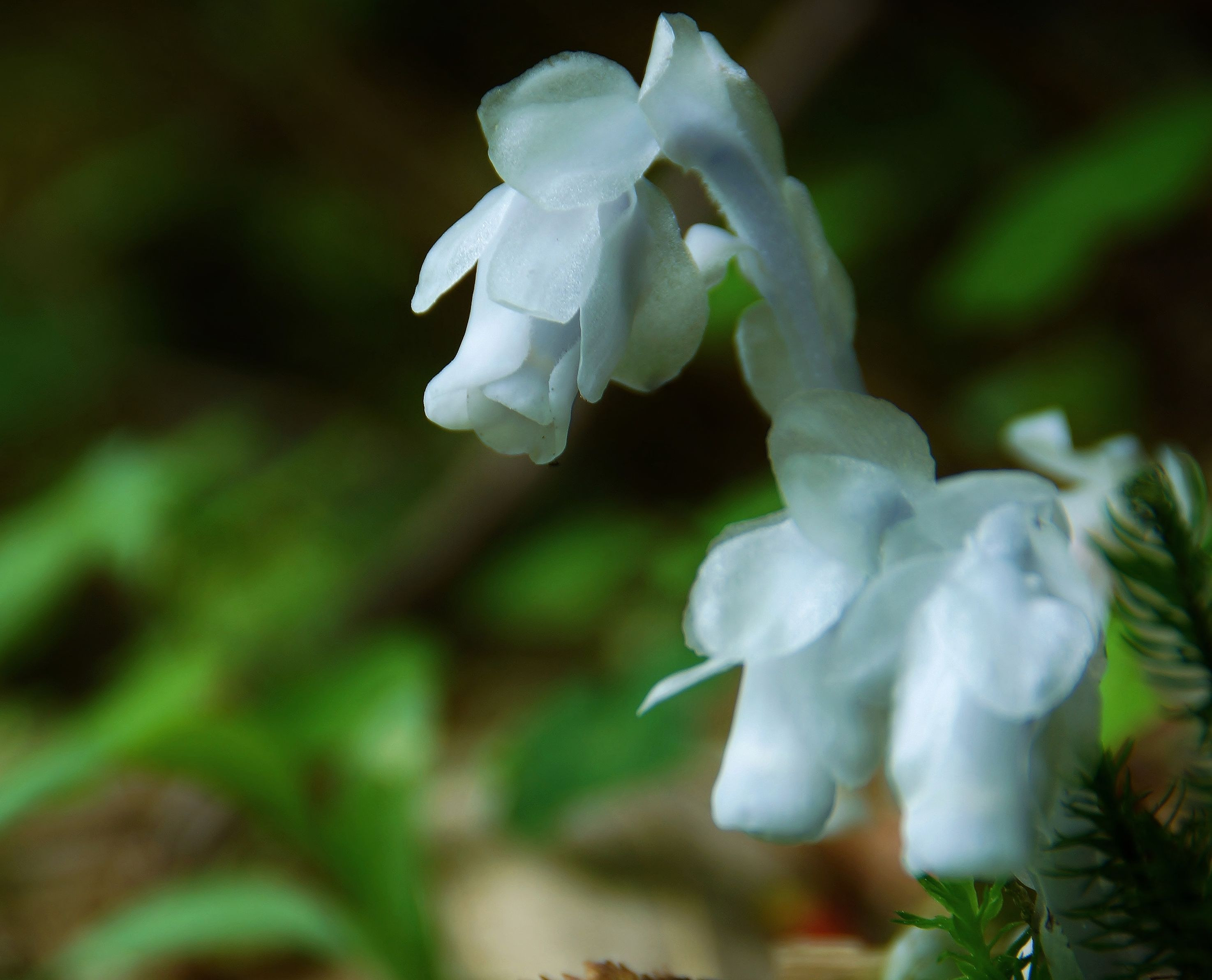 白く透明、うつむいて咲く不思議な形のギンリョウソウです。