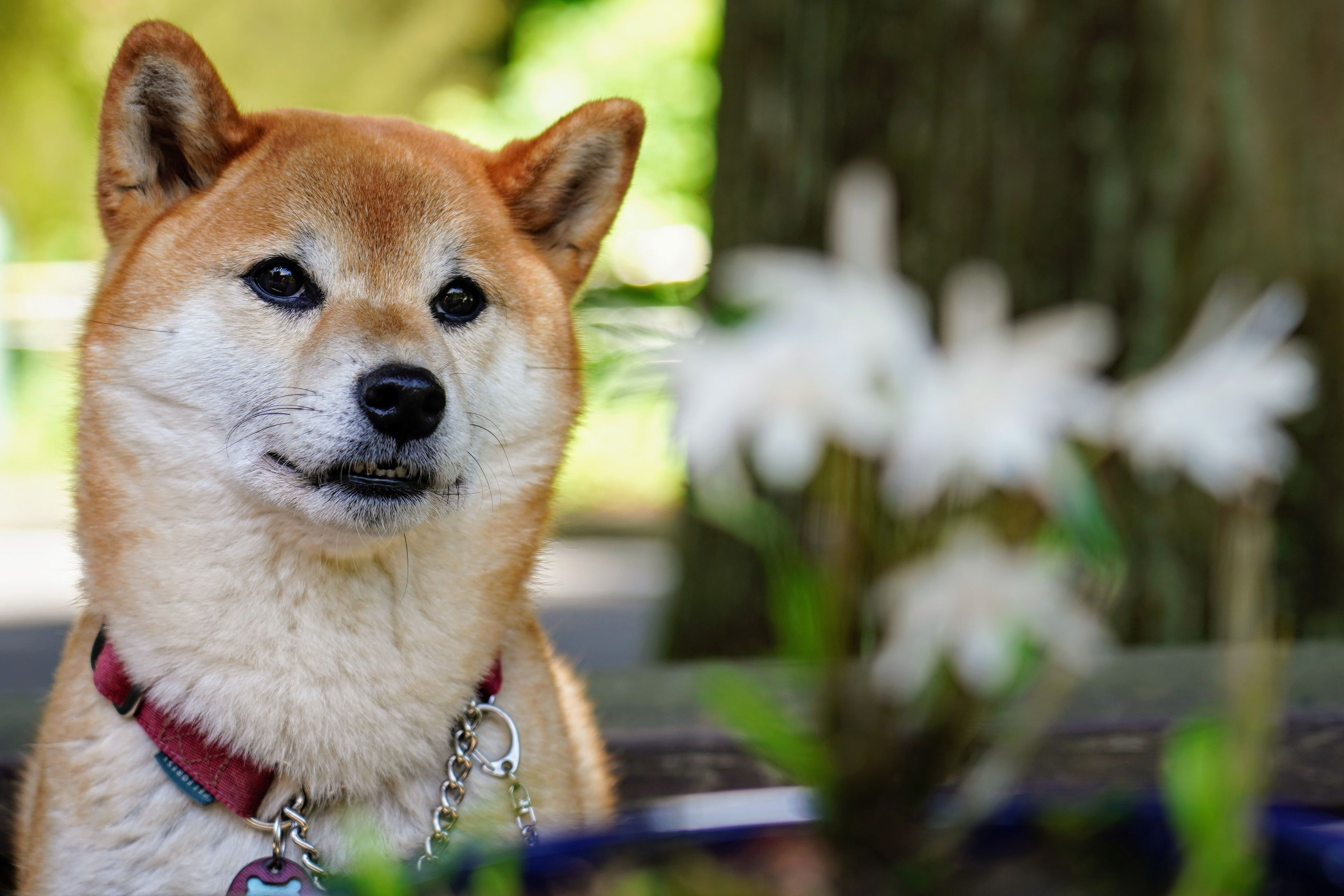 向こうにおやつを持っている飼い主さん。(笑) 行きつけのお店の看板犬です。